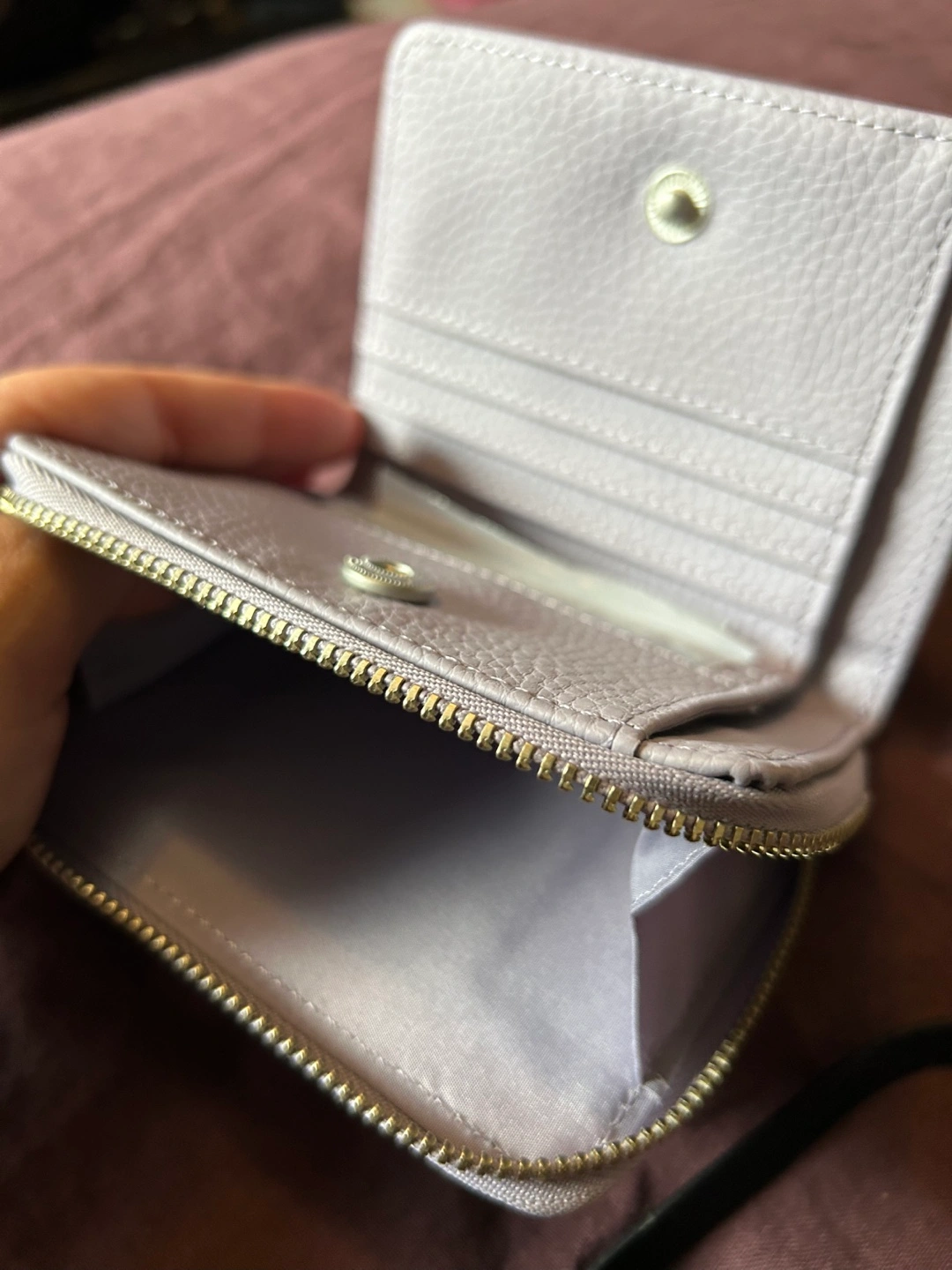 Compact zippered wallet. Features multiple card slots and a zippered closure. Vegan leather. Lilac colour. Never used, tags on.