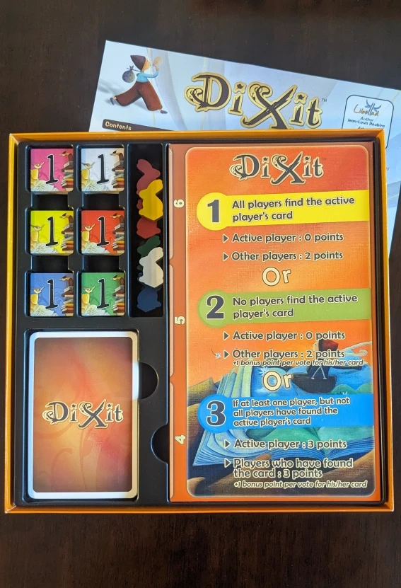 Gently used Dixit boardgame. Includes all original pieces in pristine condition, no card bents, cracks, or any damage at all, the box is also clear of any damage.
