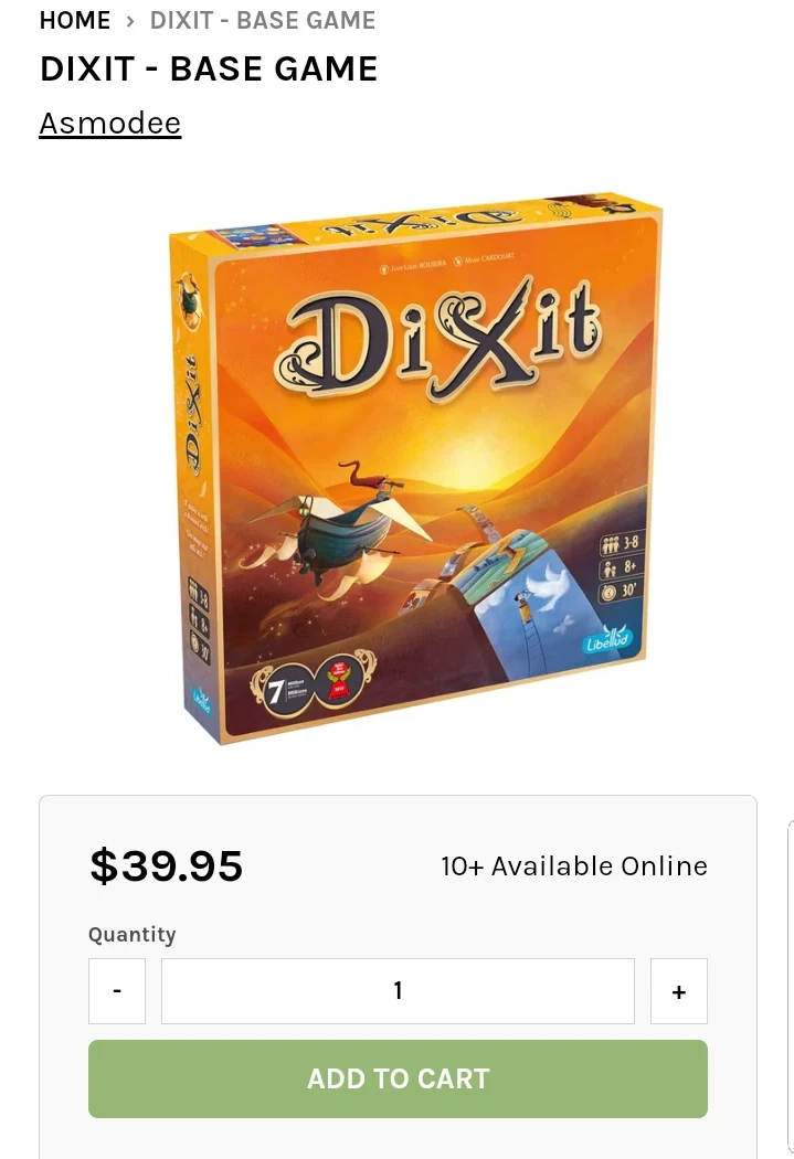 This is an older version of Dixit that, in my opinion has better quality components compared to the new Dixit Odyssey. Selling cause I got gifted a second copy and have to use that (we play with the gifted party a lot so it would be unfair to sell their game instead).