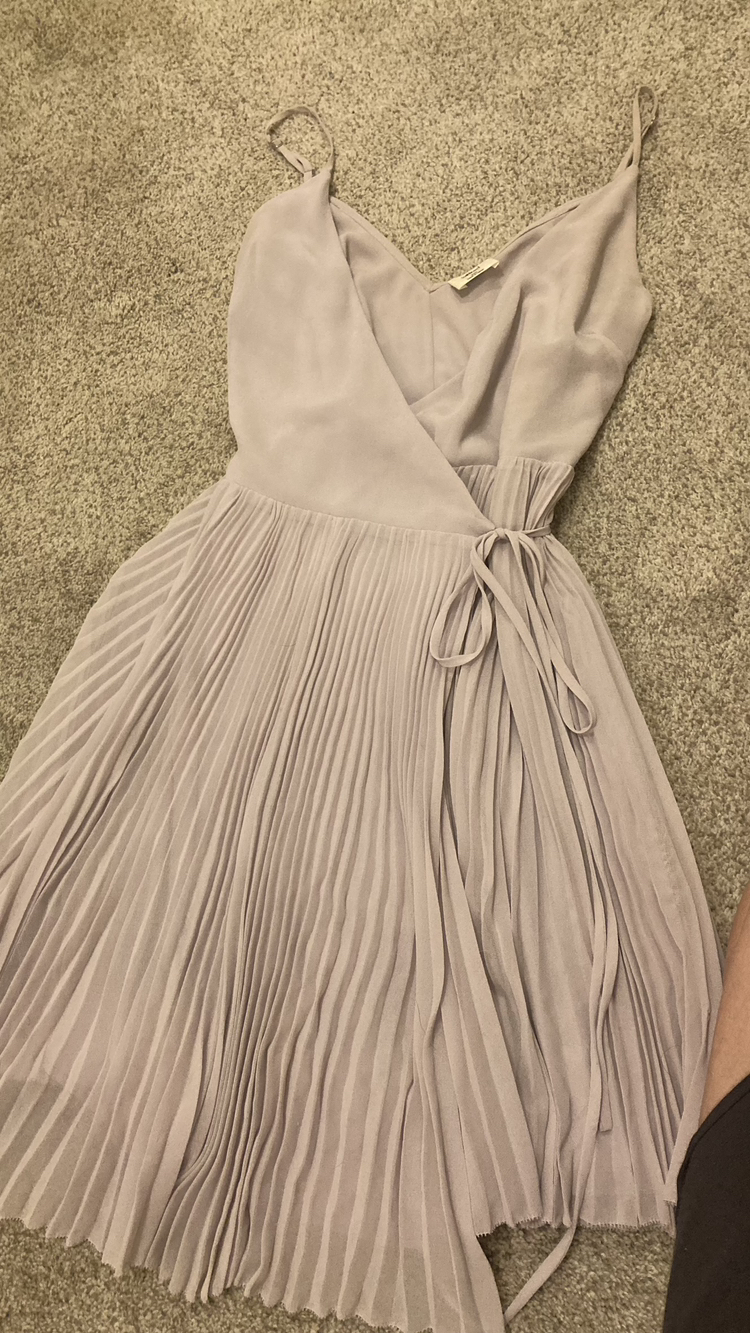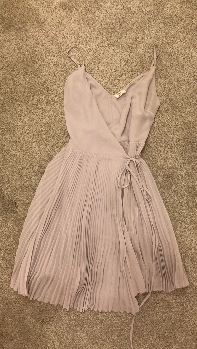 Airy, pleated chiffon wrap dress (sleeveless, mini version) in Lilac Fog, size XXS.