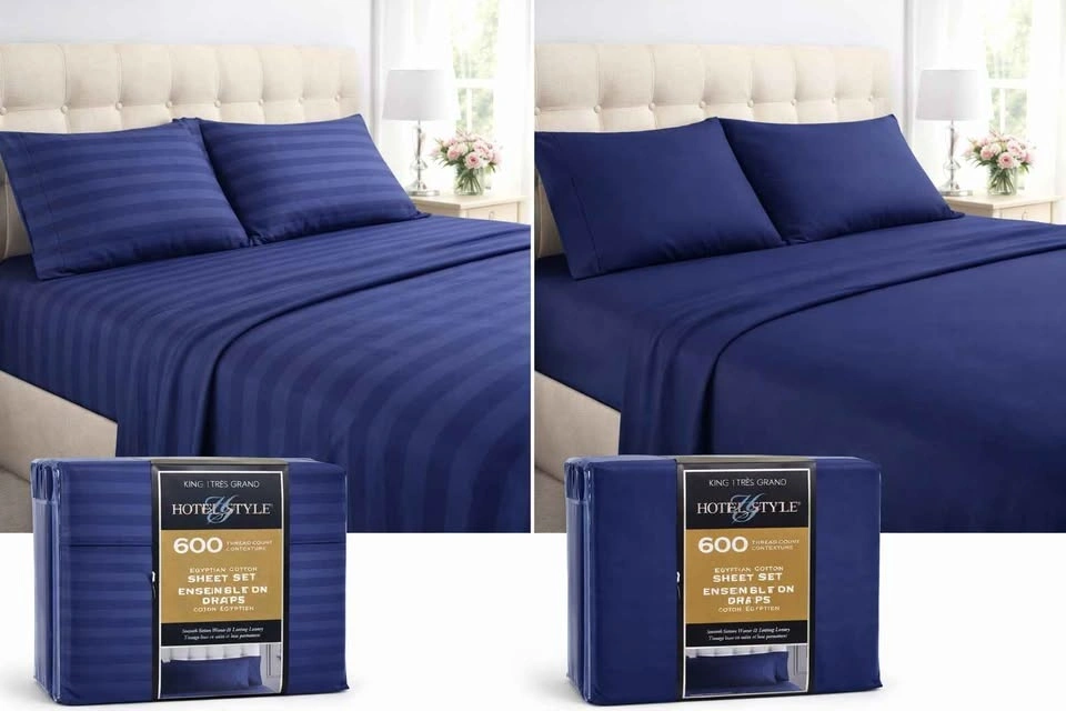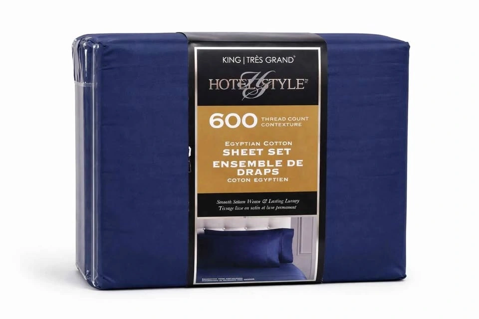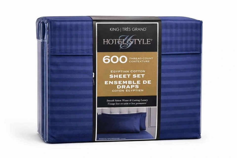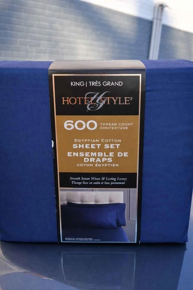 Brand new, unused, and still sealed in the original retail packaging. Outer plastic and cardboard insert show minor shelf wear from retail handling only — sheets inside are untouched. Hotel Style brand, 600 thread count Egyptian cotton sheet set. King size in deep navy blue. Smooth sateen weave is soft, breathable, and crisp. True Grip stretch corners keep the fitted sheet snug. Fits King mattresses 9–18 inches deep. OEKO-TEX Standard 100 certified. Includes full 4-piece set: 1 King flat sheet (110 x 104 in), 1 King fitted sheet (78 x 80 in), 2 King pillowcases (21 x 40 in). This is a clean, new-in-package set — a great hotel-style upgrade without paying store prices. If the ad is up, it's available. Pickup near Uptown Mall, Victoria. Cash or e-transfer. Pickup, meet, or delivery available. Price: $60 firm.