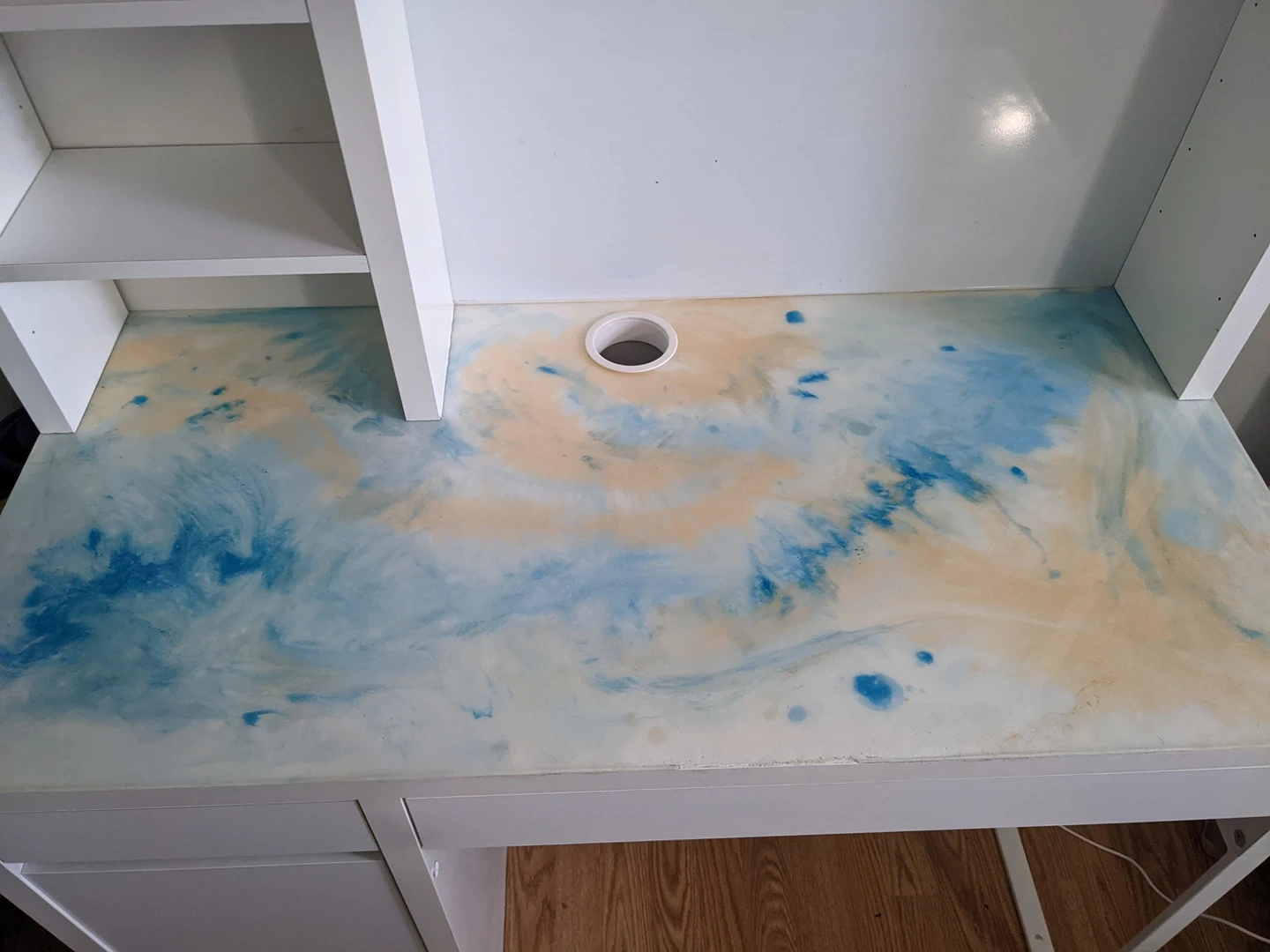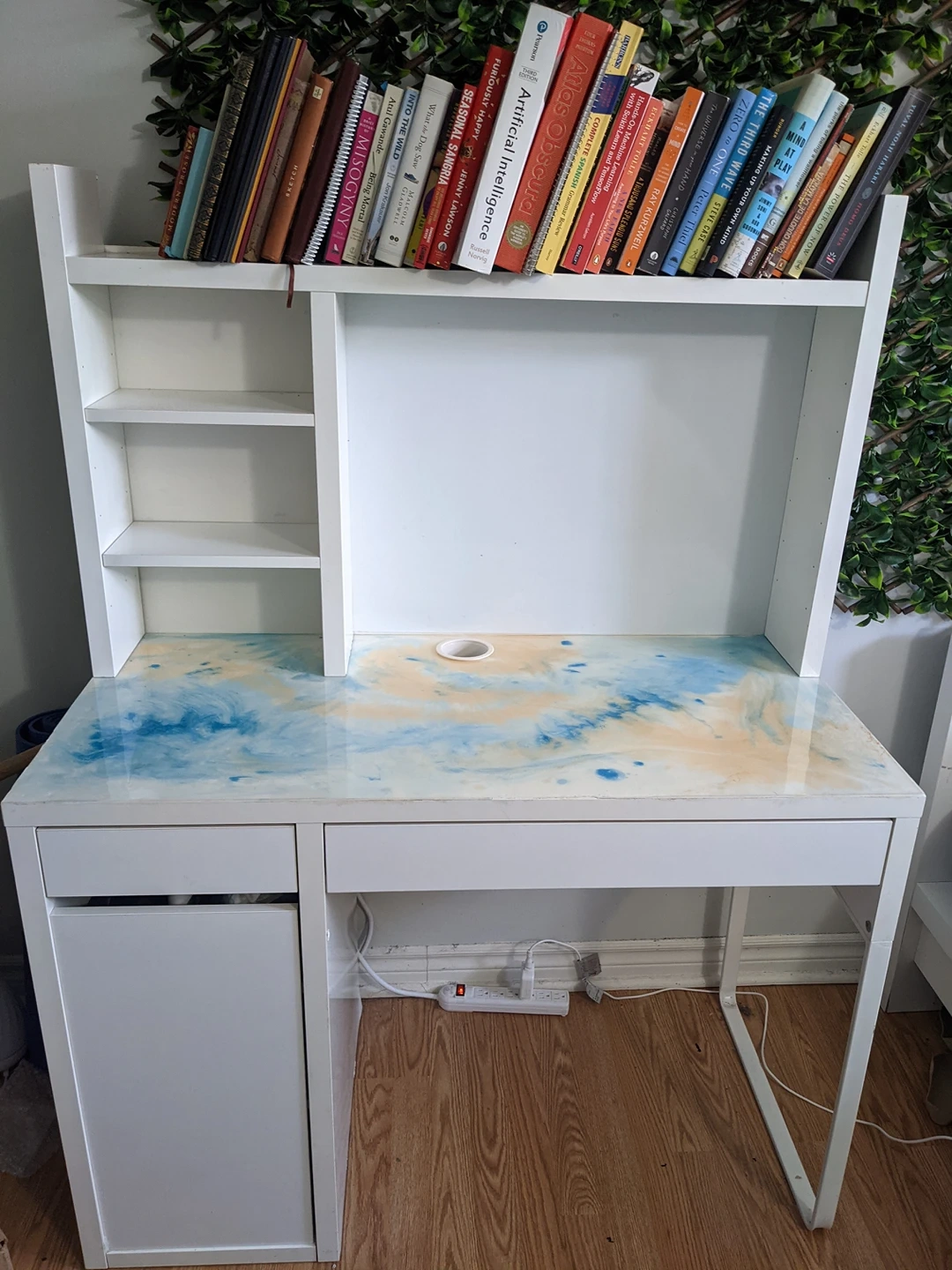 Customized this desk with a resin gold and blue top. The desk is in good condition, it functions perfectly well, but it's got markings from years of use. I can separate the top and bottom for pickup
