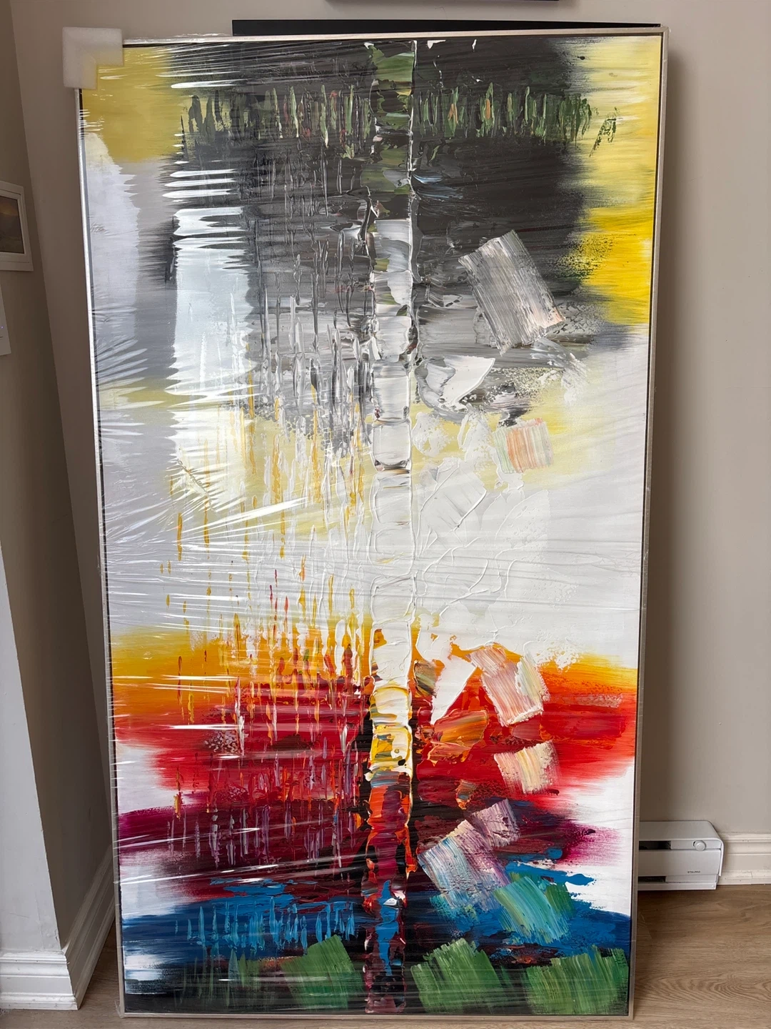 This is a large abstract painting with heavy texture. It's framed and wrapped in plastic for protection. Bright colours include red, yellow, orange, blue and black. It's a statement piece for any room!