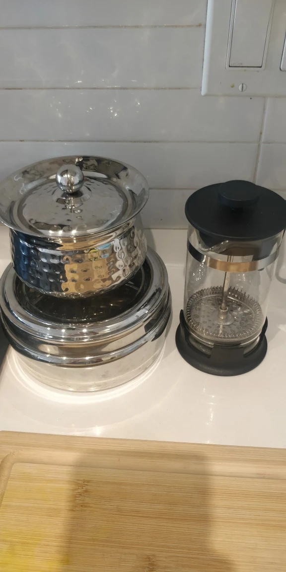Set includes a hammered stainless steel serving pot with lid and a smaller stainless steel bowl. Also includes a glass and stainless steel French press. Great for serving food or making coffee!
