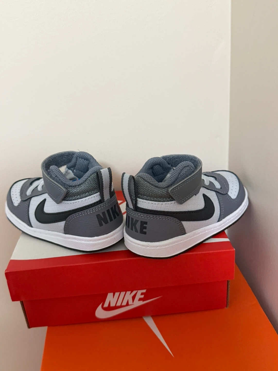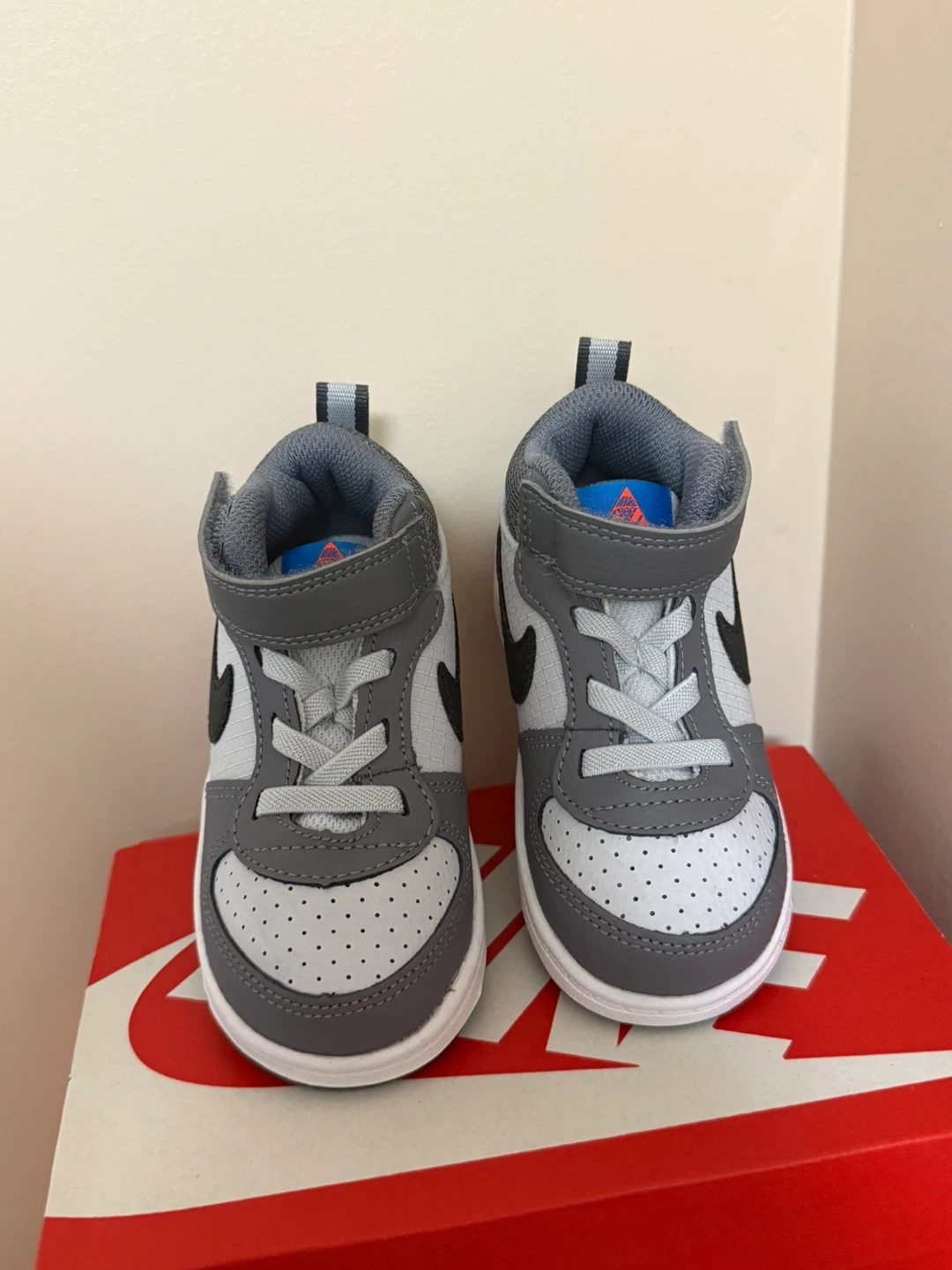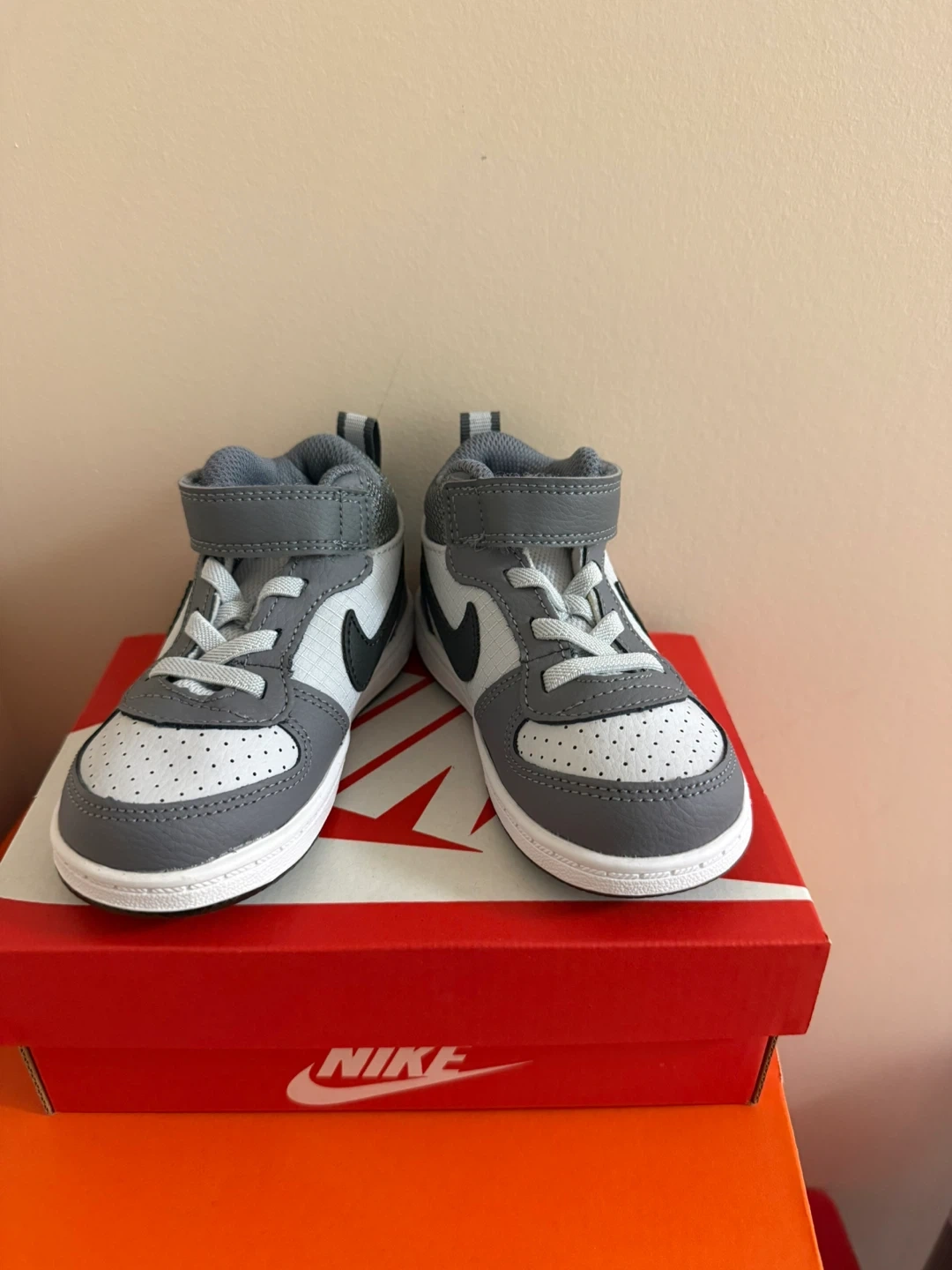 Brand new never worn. These are Nike high-top sneakers for toddlers. They're grey and white with a black Nike swoosh. Includes the original Nike box.