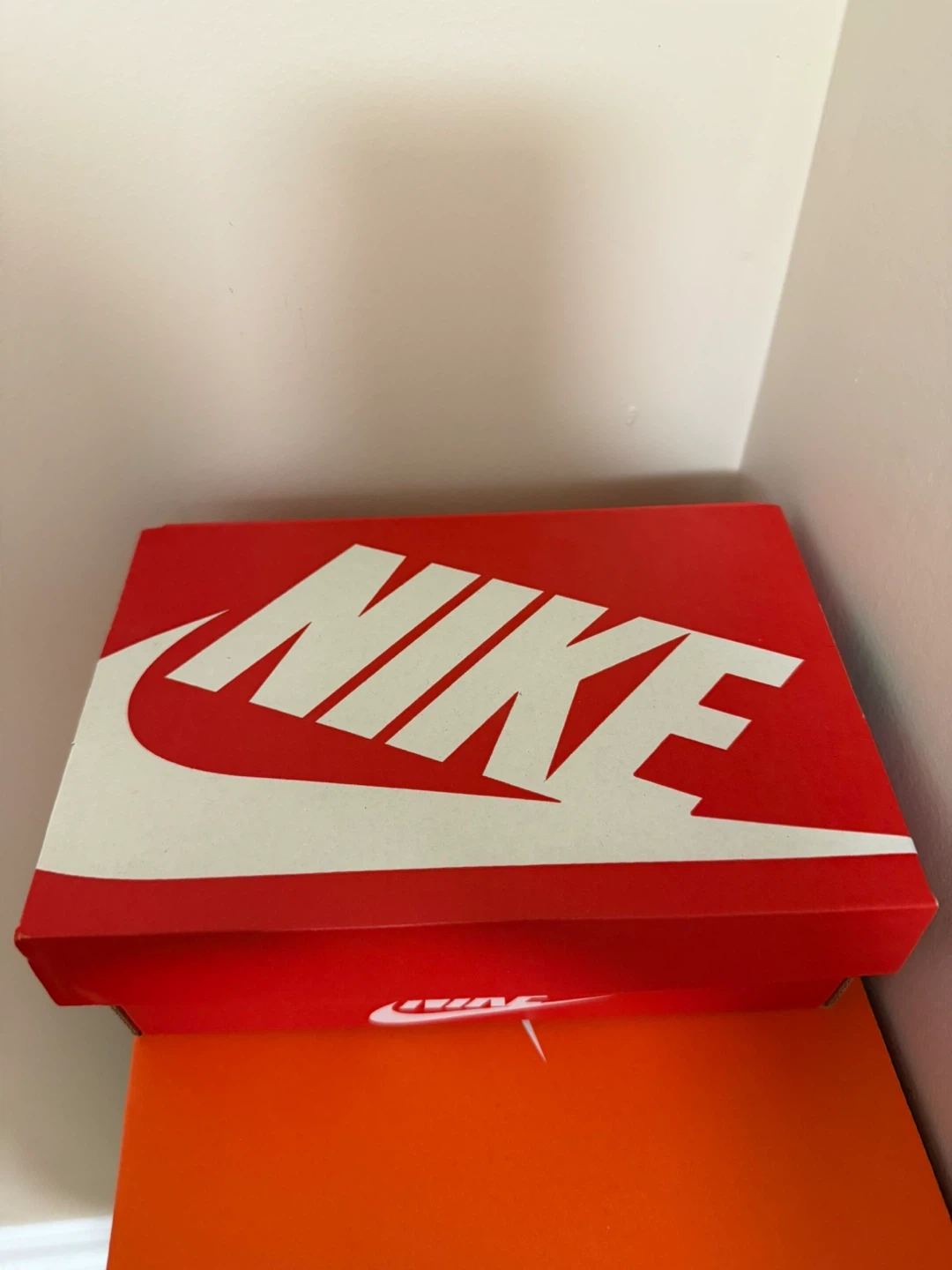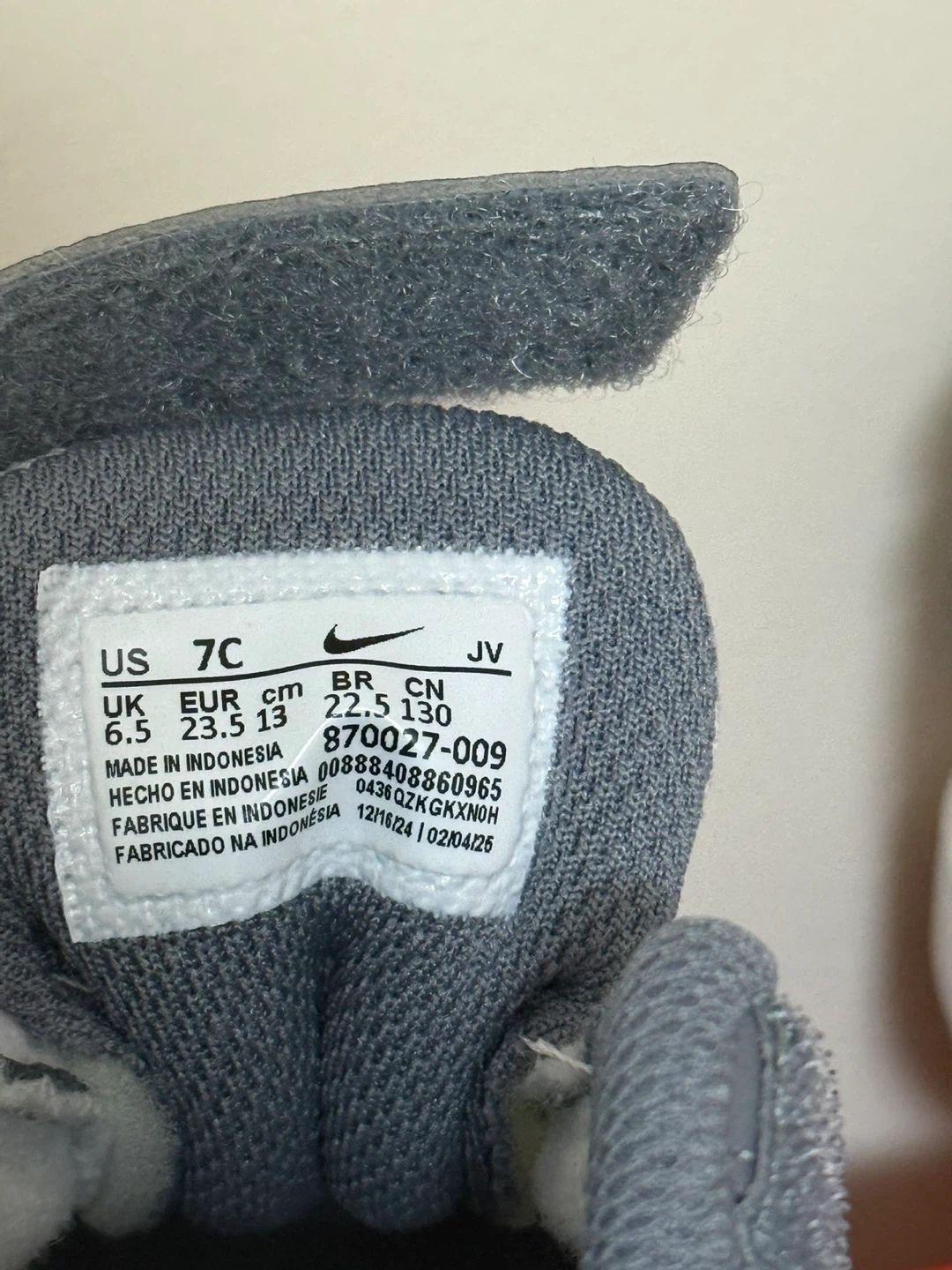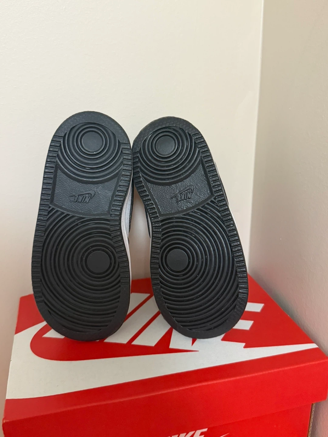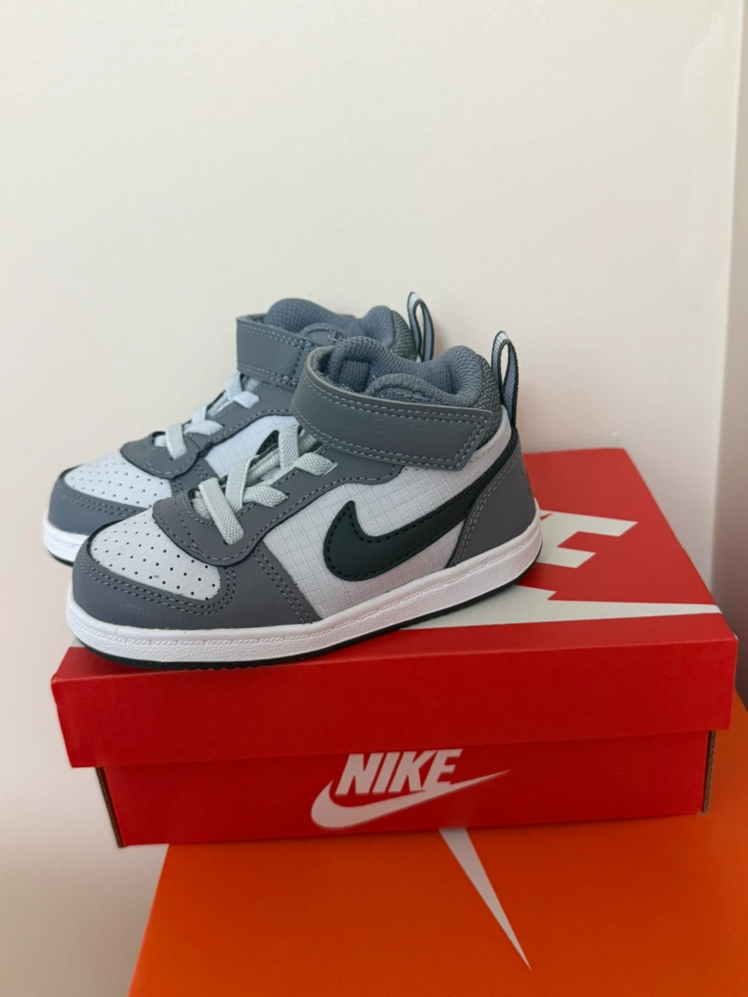 Brand new never worn. These are Nike high-top sneakers for toddlers. They're grey and white with a black Nike swoosh. Includes the original Nike box.