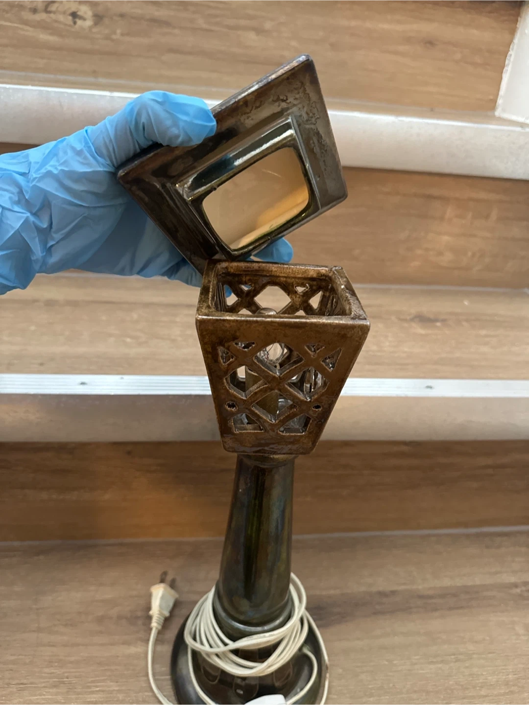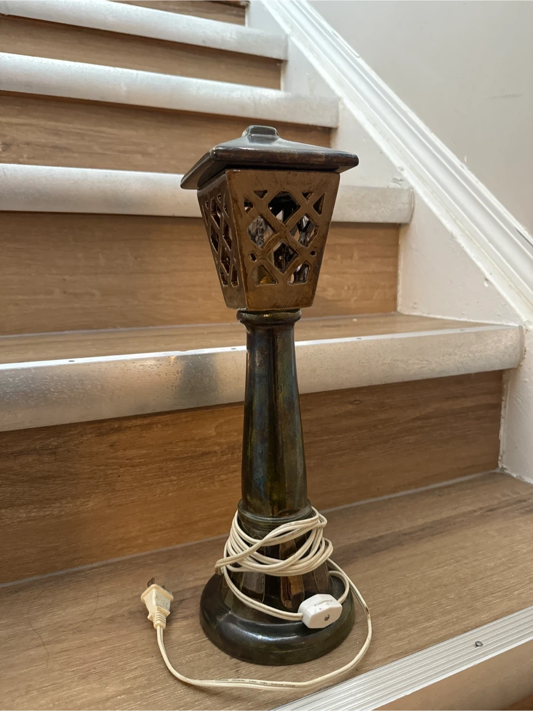 This decorative table lamp has a unique vintage design reminiscent of a lantern. It's made of a glazed ceramic material with a rustic brown and green finish. The lamp features an ornate cut-out design on the shade, adding a touch of elegance to any room. This would be a lovely accent piece for a living room or bedroom. Good for indoor or outdoor use.