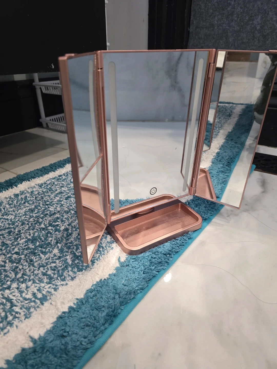 This tri-fold makeup mirror has integrated LED lights for bright, clear illumination. It features a rose gold finish and a convenient base tray for small items. It's ideal for applying makeup or for detailed grooming tasks.
