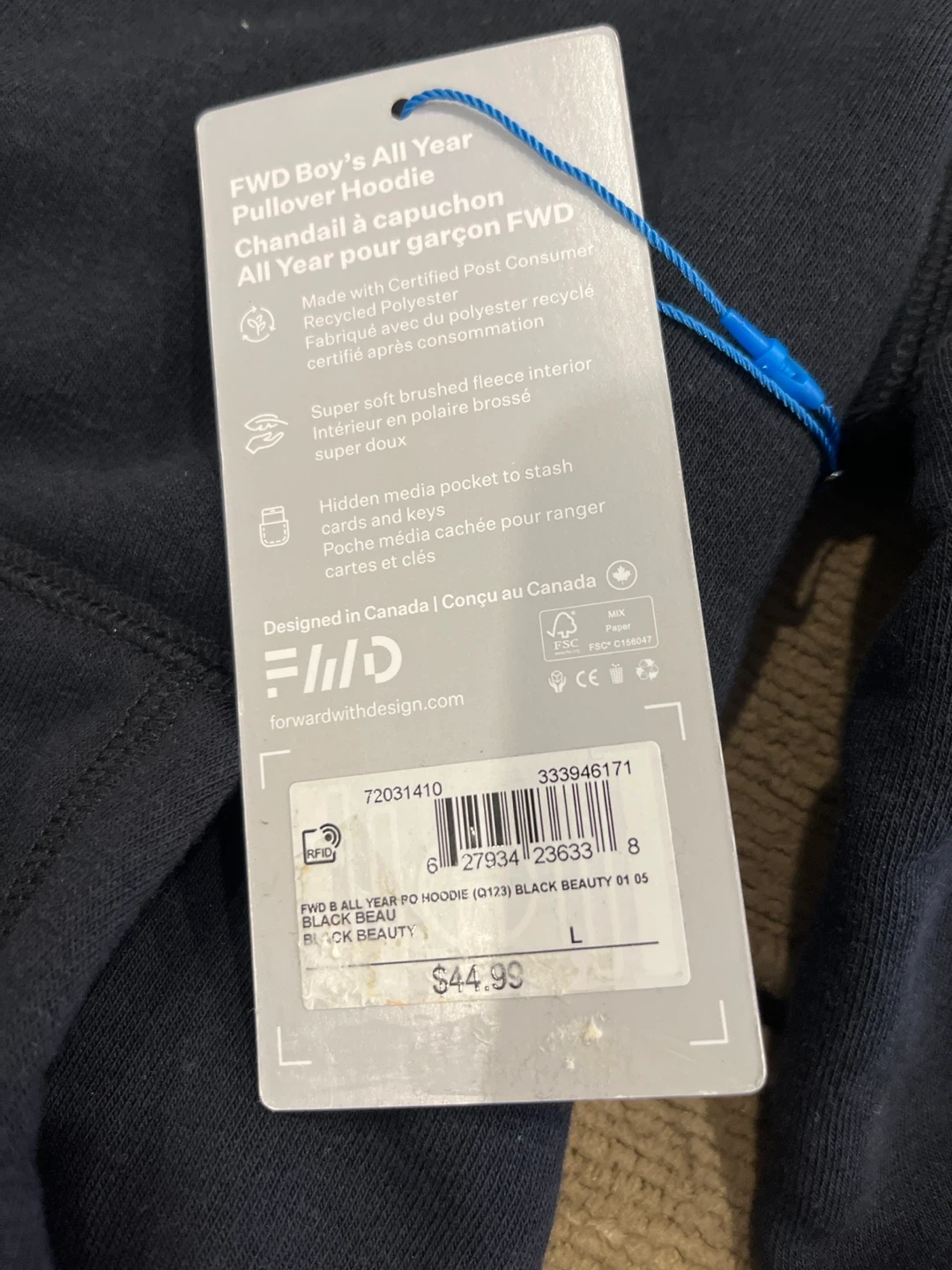 FWD Boy's All Year pullover hoodie in black. Made with recycled polyester and features a hidden media pocket. It's super soft brushed fleece interior. Size is large.