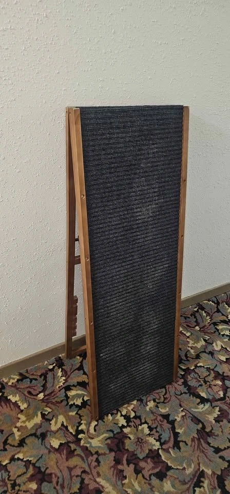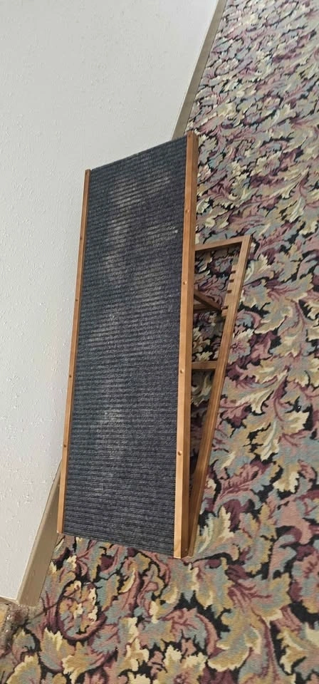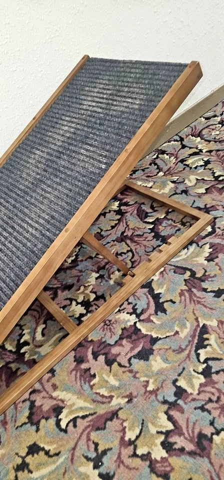 Adjustable pet ramp. Wood frame with carpeted surface. Great for helping dogs or cats get on bed or couch. Folds for easy storage.
