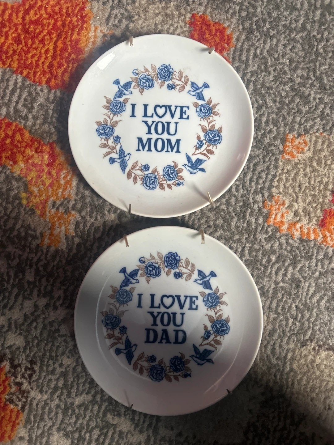 These decorative plates say 'I Love You Mom' and 'I Love You Dad'. They feature a floral and bird design. Perfect for gifting on Mother's Day or Father's Day!