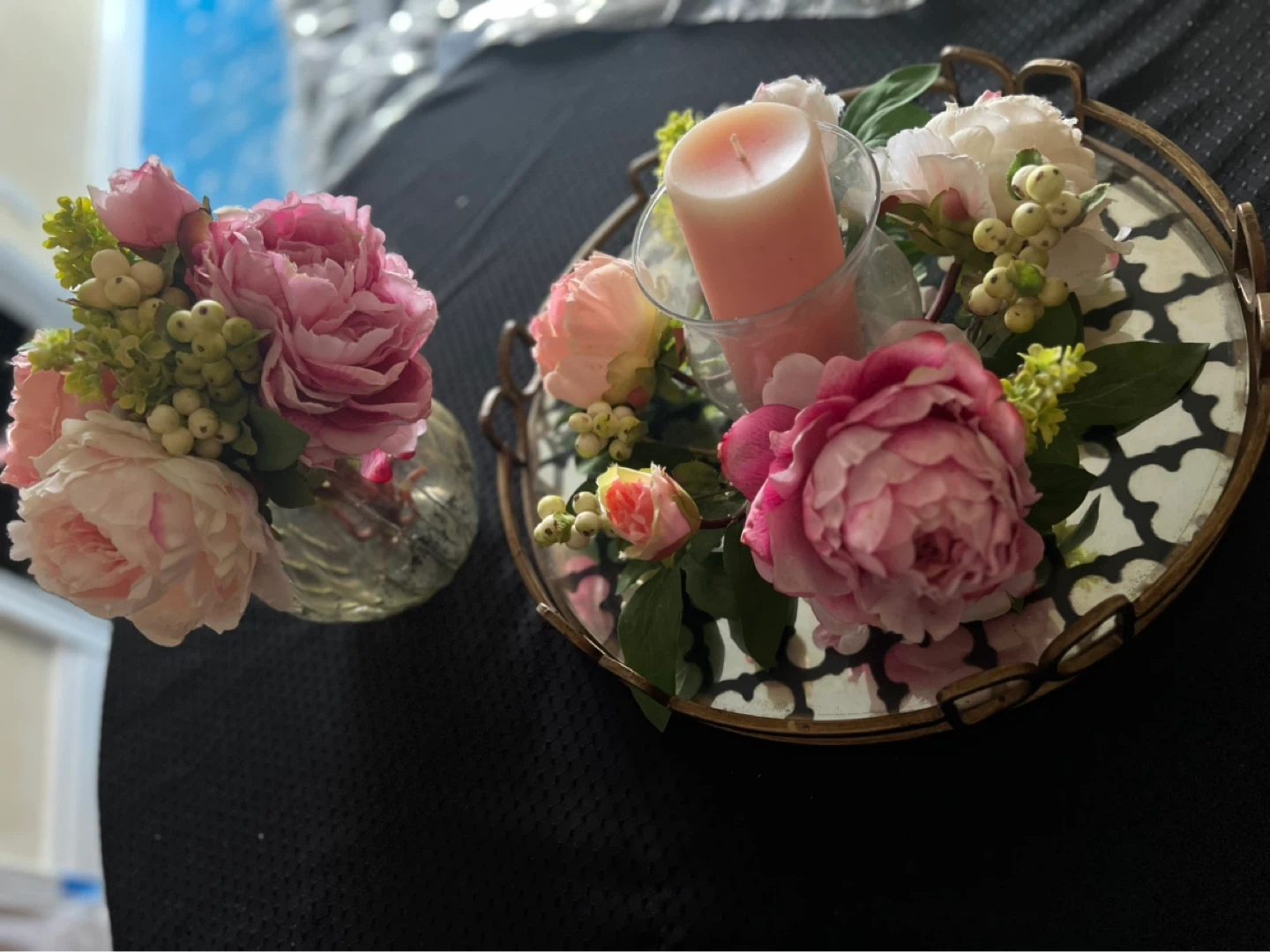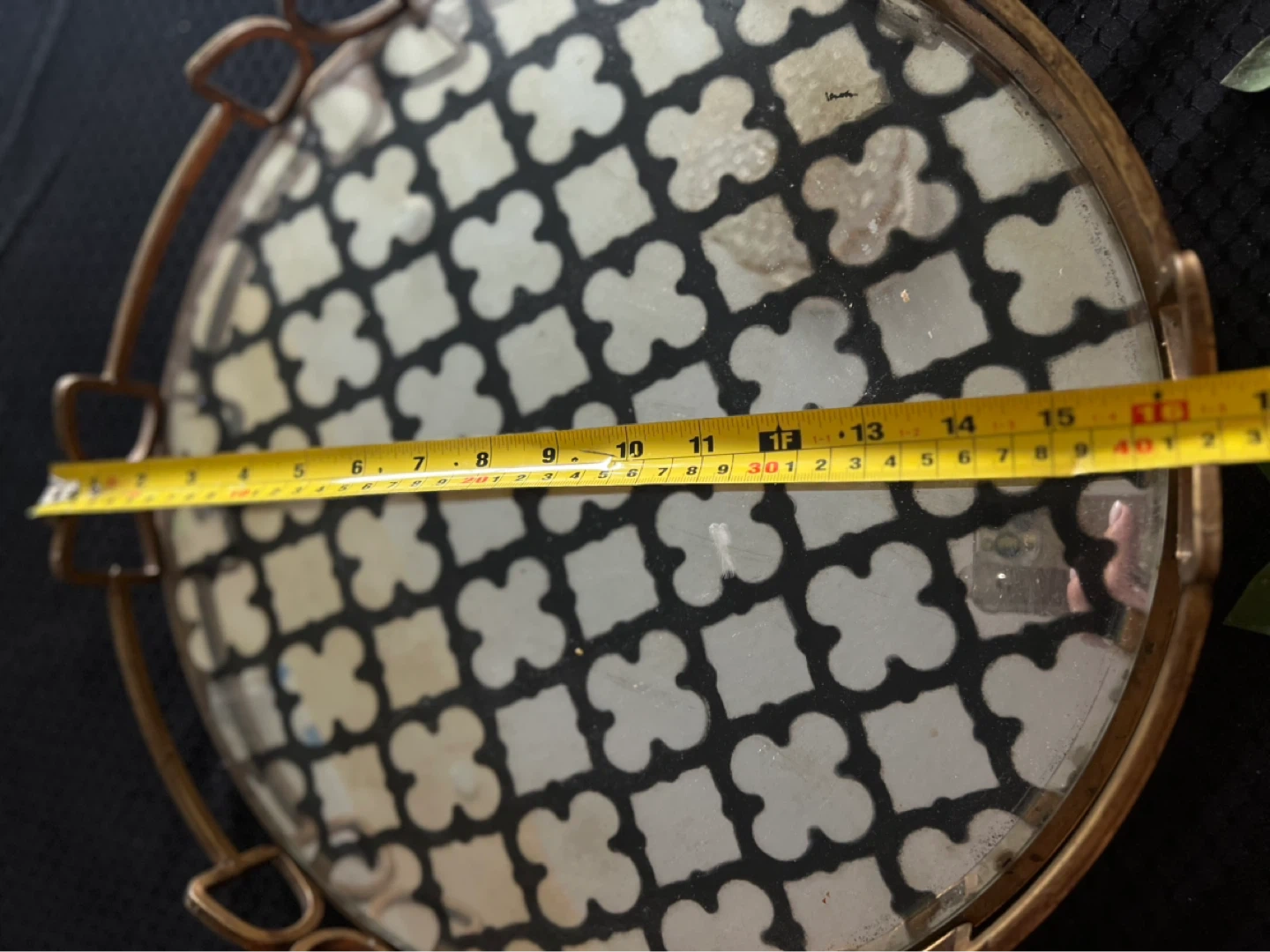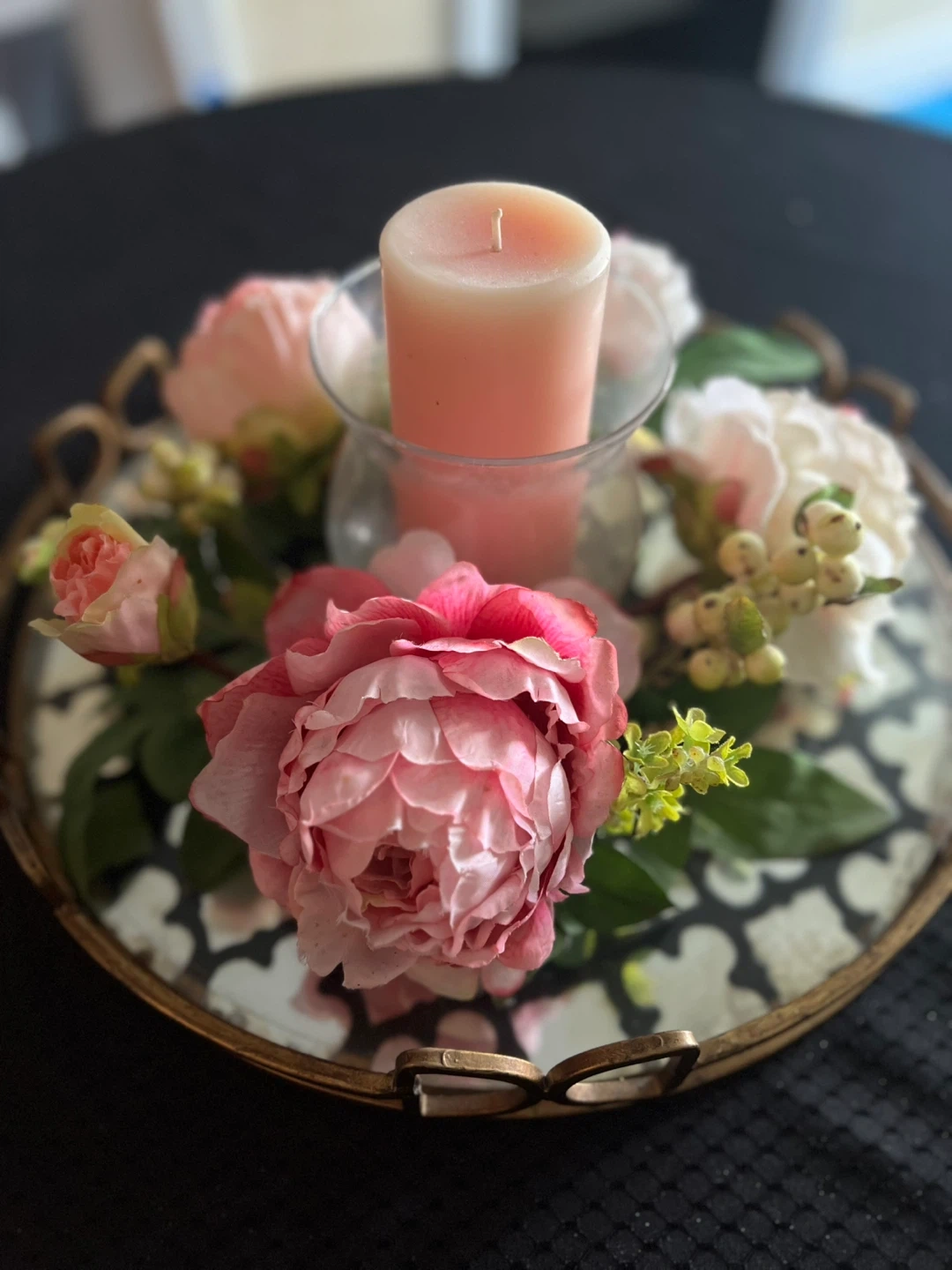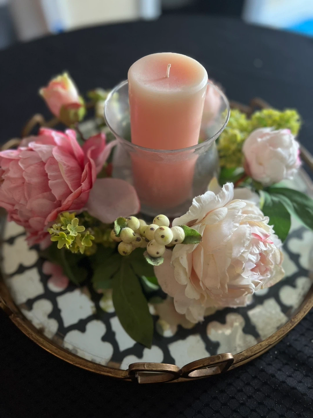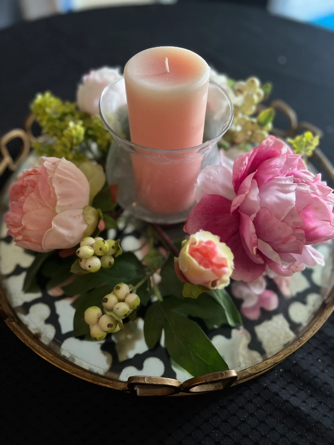 Decorative round tray with a gold-tone metal trim, featuring a mirrored surface with a black quatrefoil pattern. It comes with faux pink and white peonies, greenery, and a decorative pale pink candle. The tray measures approximately 12 inches in diameter. This set's lovely colours make it a nice accent piece for a table!