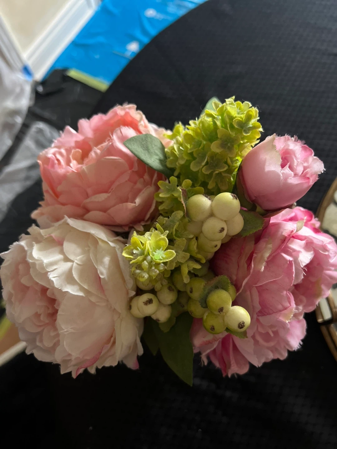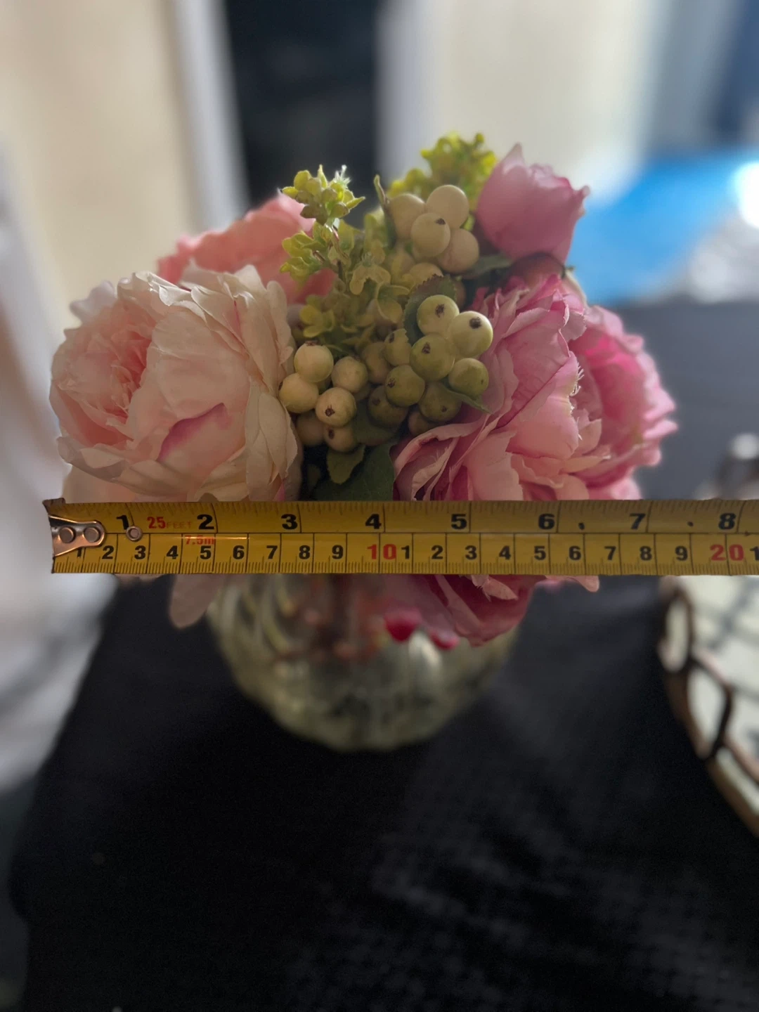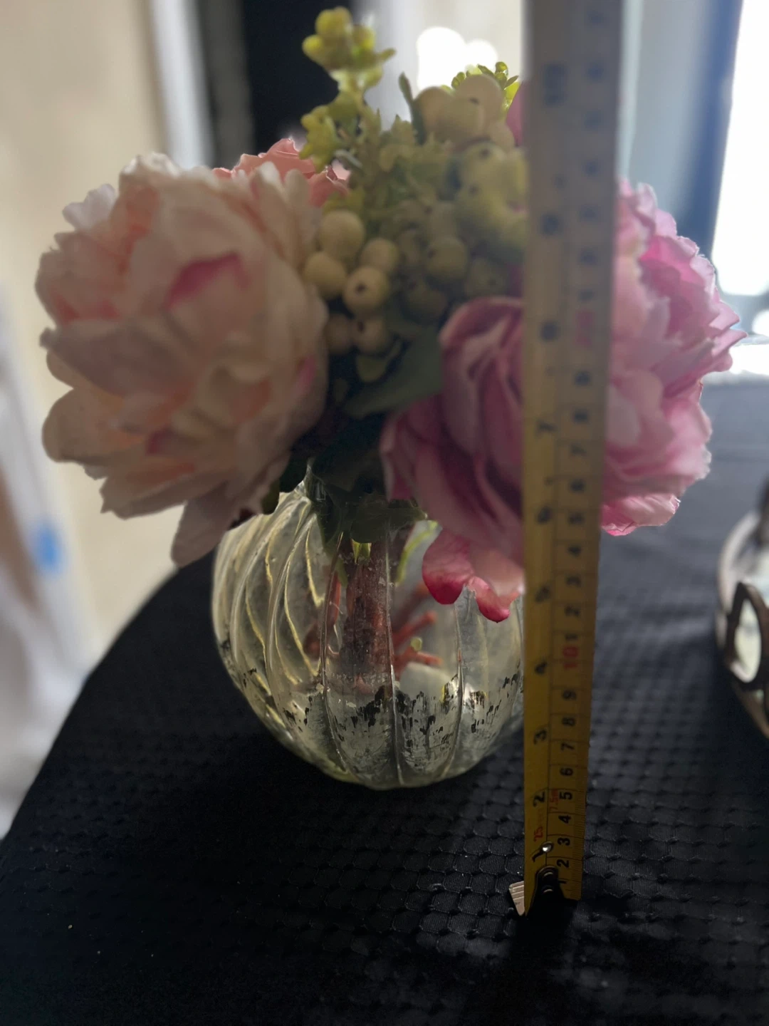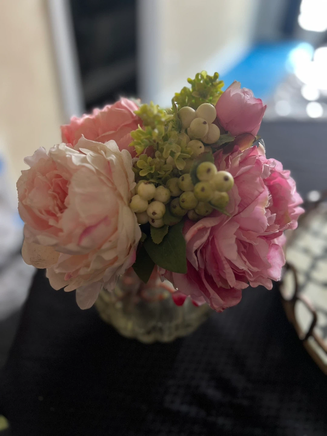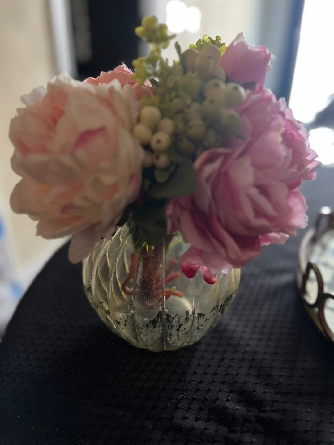 Decorative round tray with a gold-tone metal trim, featuring a mirrored surface with a black quatrefoil pattern. It comes with faux pink and white peonies, greenery, and a decorative pale pink candle. The tray measures approximately 12 inches in diameter. This set's lovely colours make it a nice accent piece for a table!