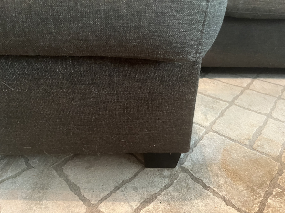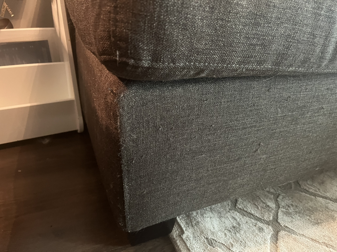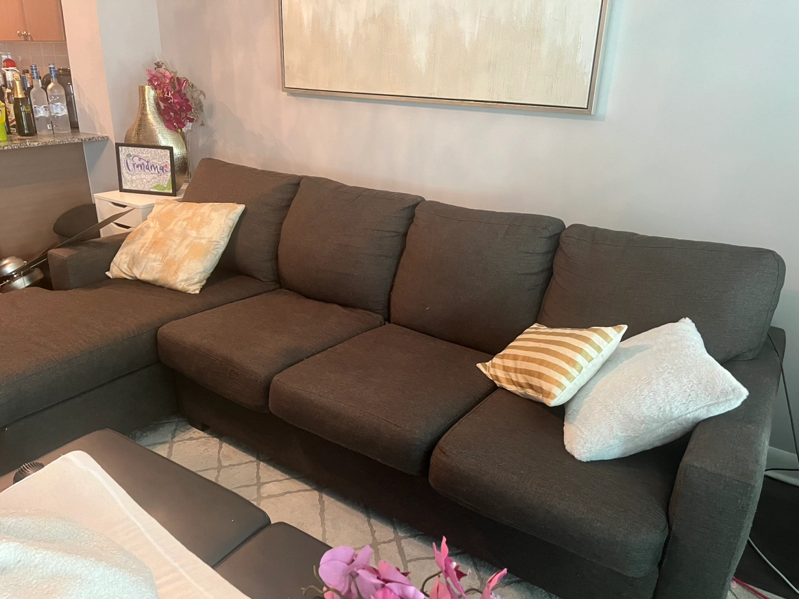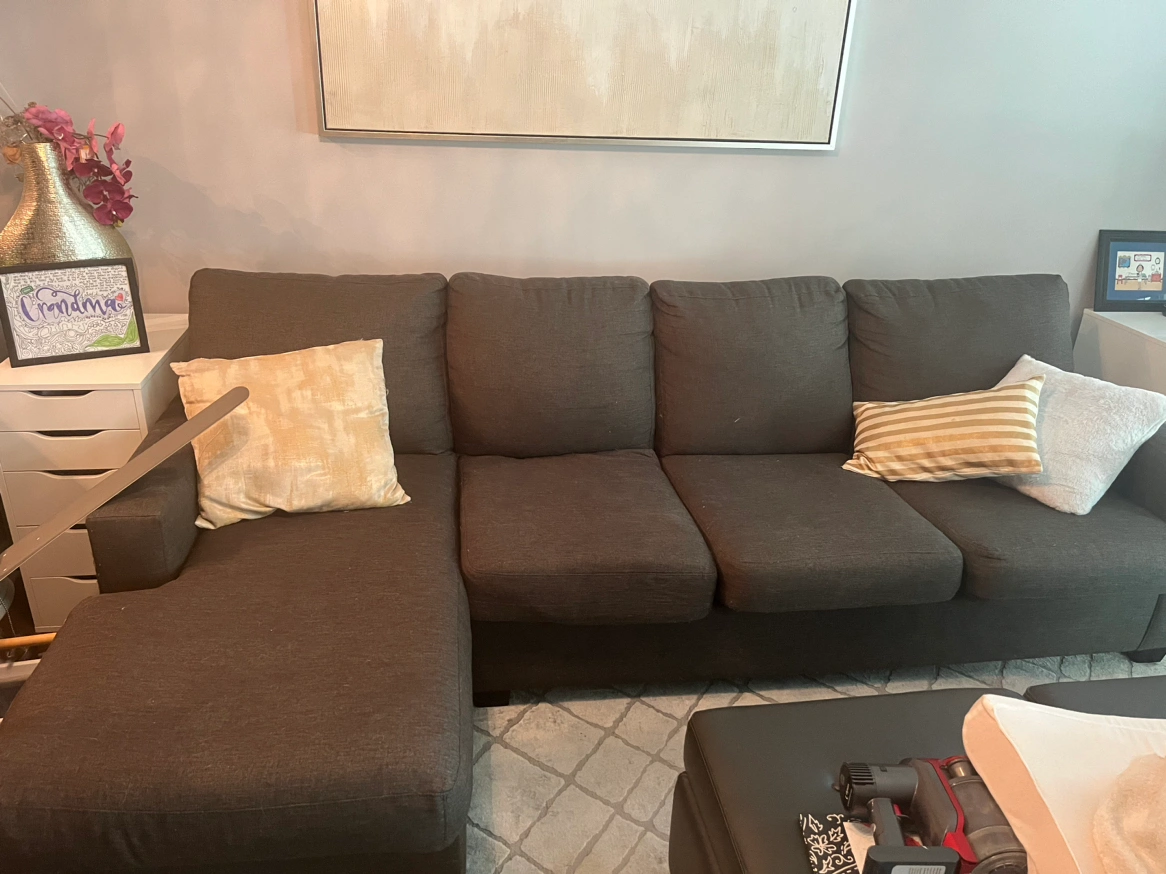 Chaise detaches easily. Very comfortable couch 1 cushion needs the zipper to be fixed as shown in pic The covers of the cushions are easily removable and can be washed Still has a lot of life to it as it is in great condition For pick up near Dufferin and Wilson Cat in the home