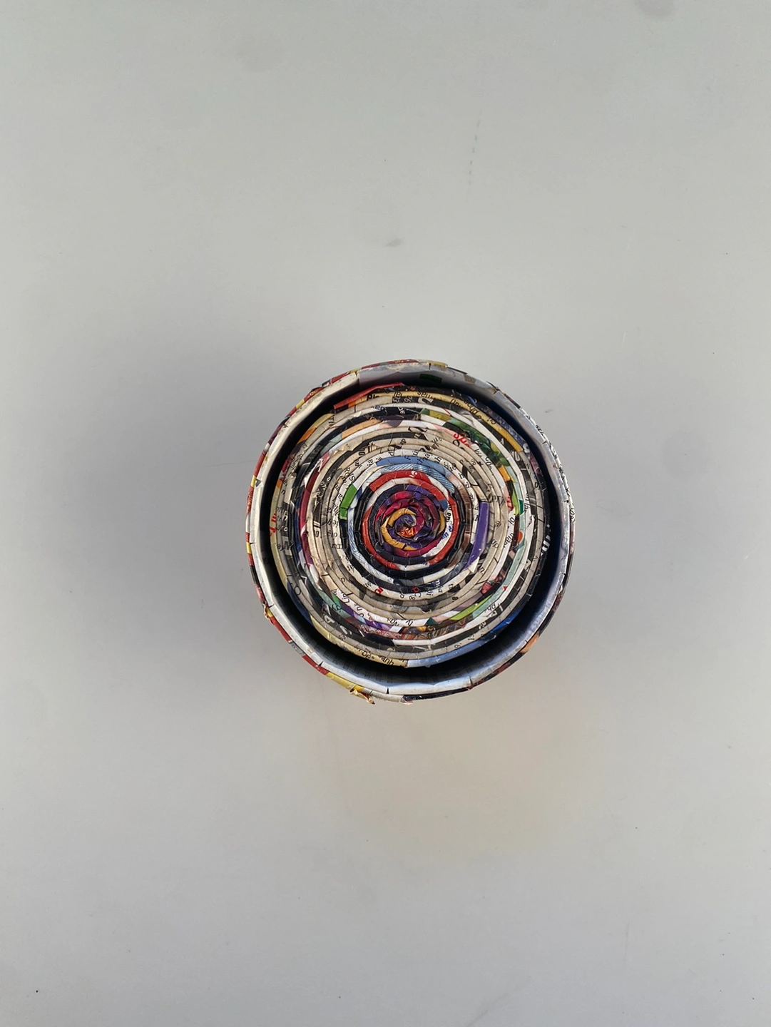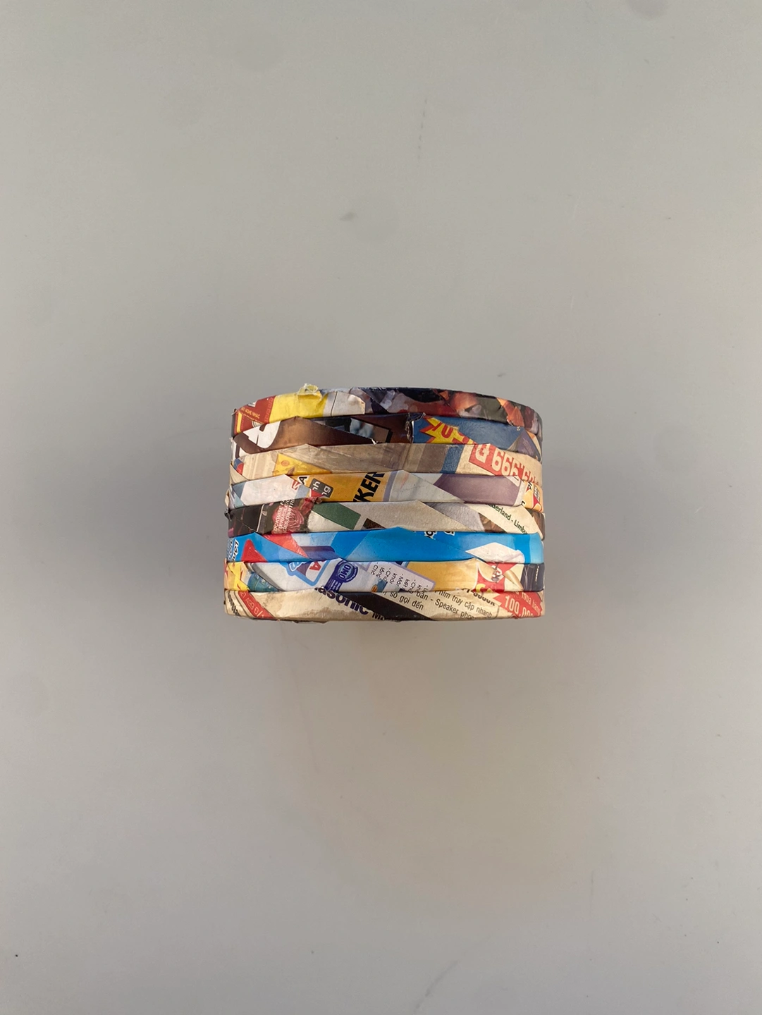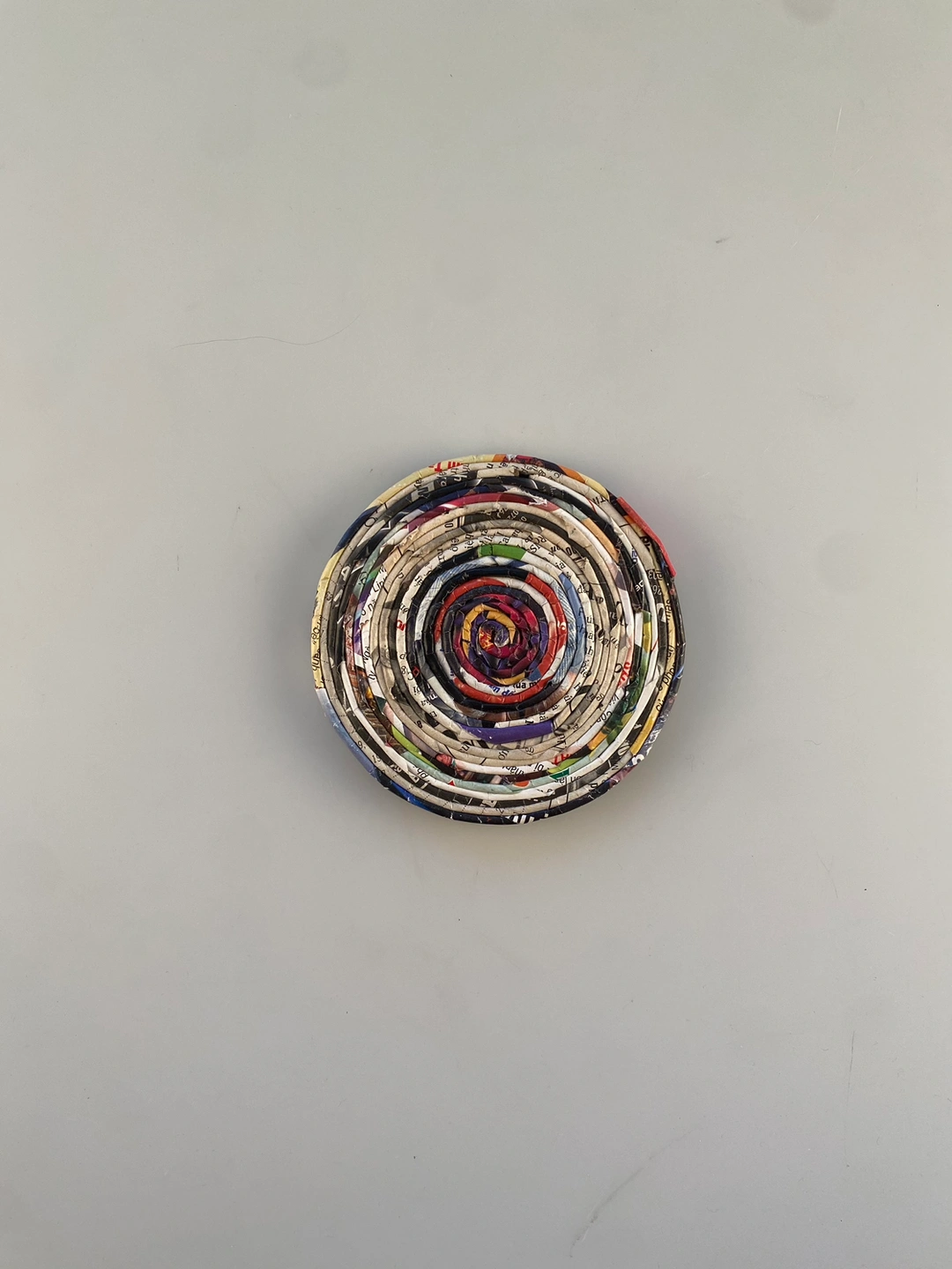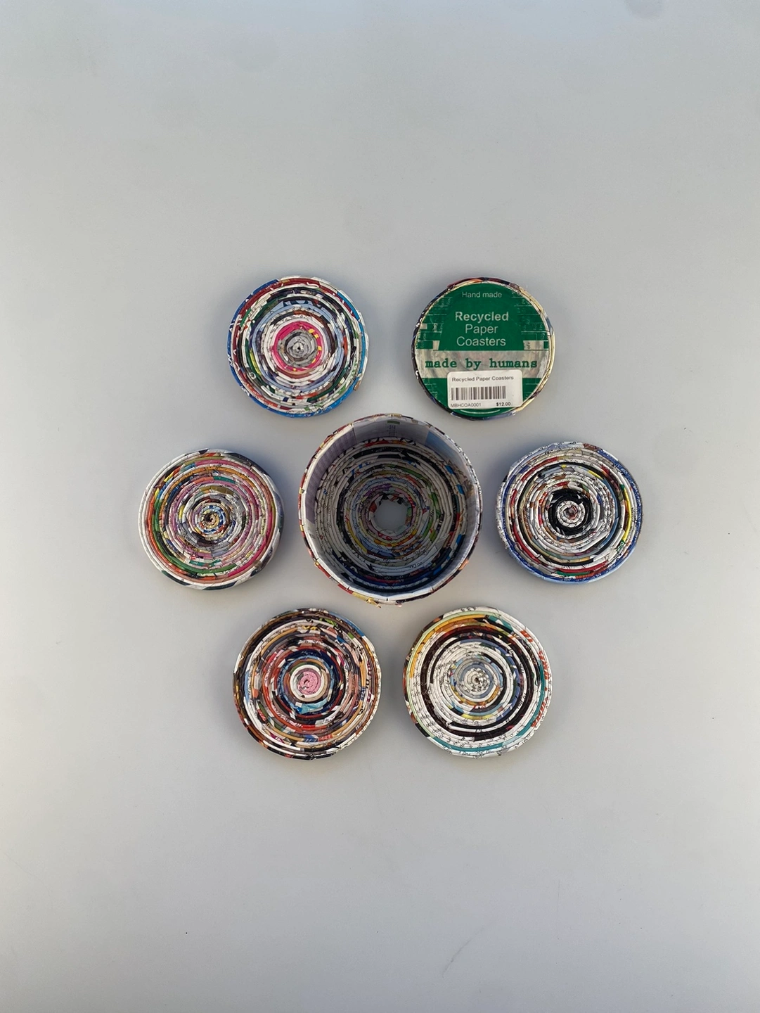 New recycled paper coaster set from made by humans. The coaster holder is approximately 2.75” tall and 4.5”wide. Comes with 6 coasters that are approximately 3.75” wide. Hand made in Vietnam. One of a Kind!