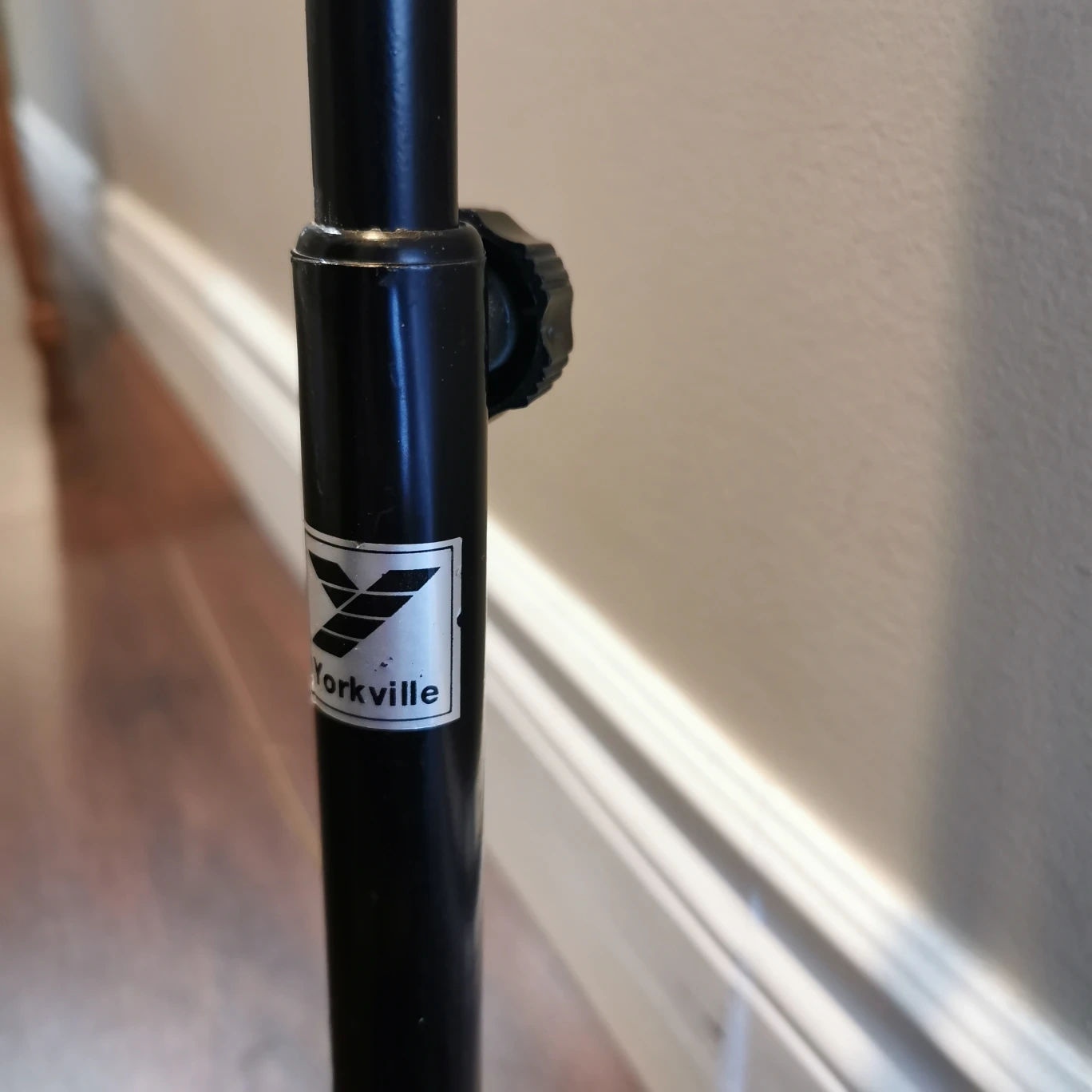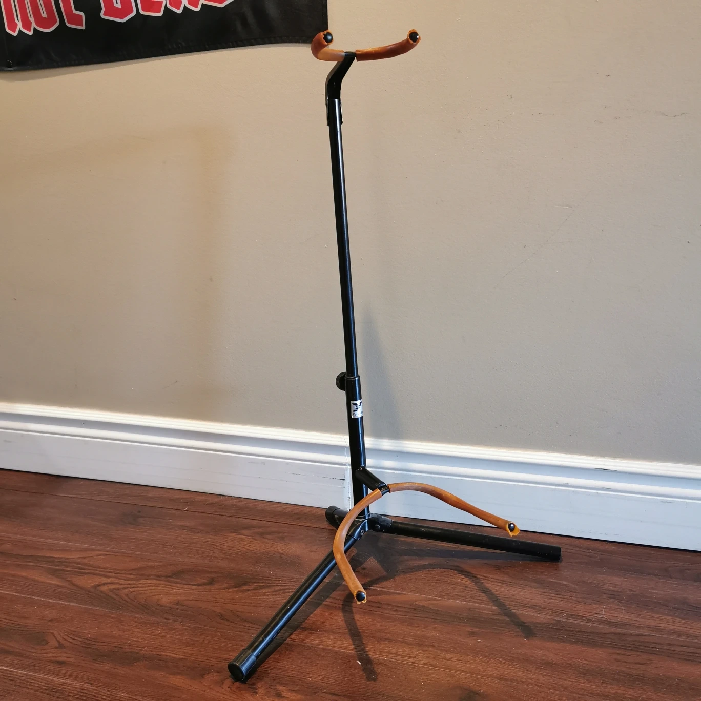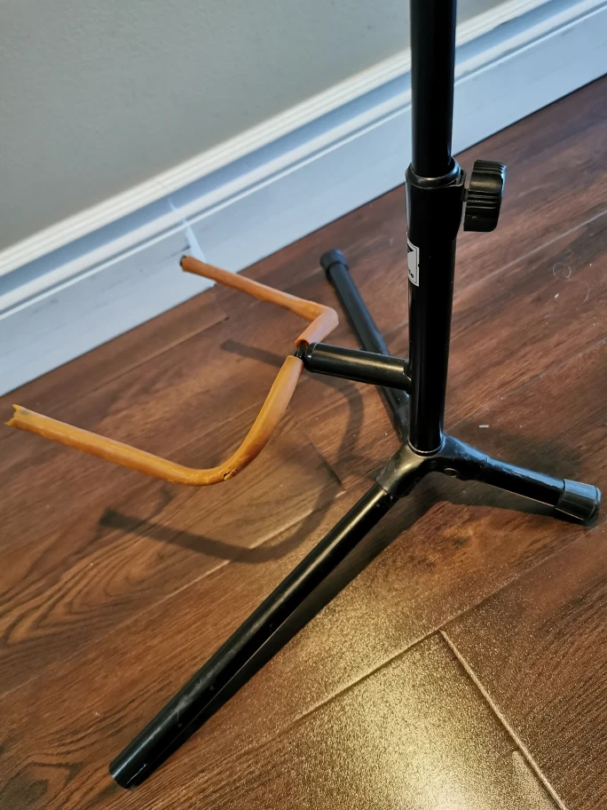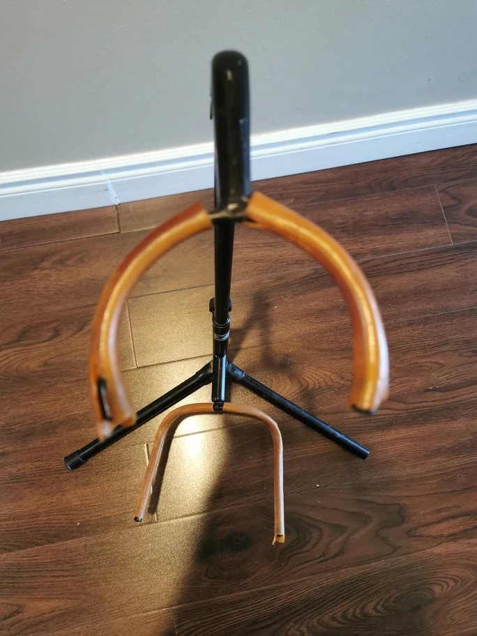Yorkville guitar stand. Structurally it is still very sturdy and still fully adjustable. However, there is a lot of wear on the rubber sleeves, and one of the foot caps is missing.