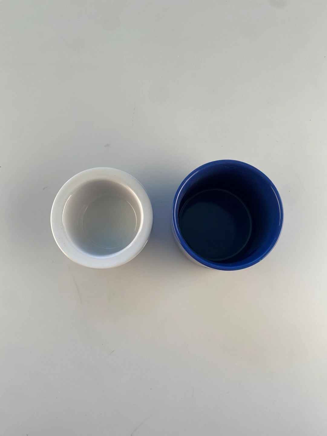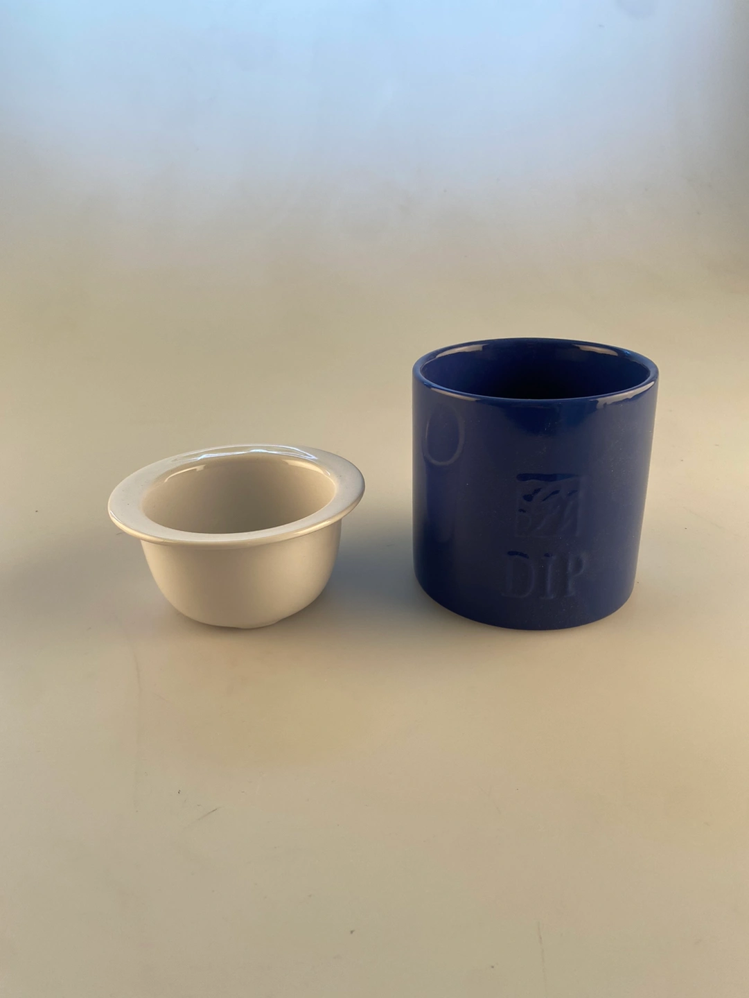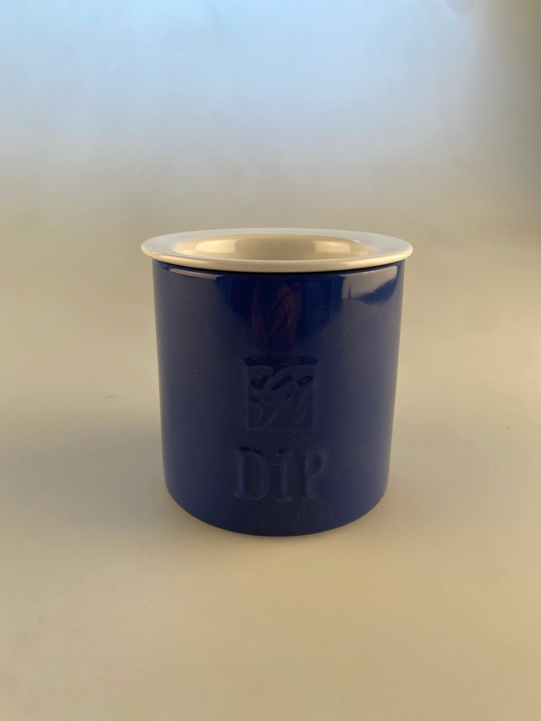 Keep your tasty dips cool so that you can chill. Just add ice to the bottom to keep your dip fresh for hours! This porcelain blue dip chiller from the Gourmet Village Bistro Collection is new in box, but the 10+ year old seasoning mix has been tossed. The blue dip chiller measures around 4” X 4” X 4” and the white dip bowl insert is around 2” deep. Dishwasher, Microwave & Oven Safe.