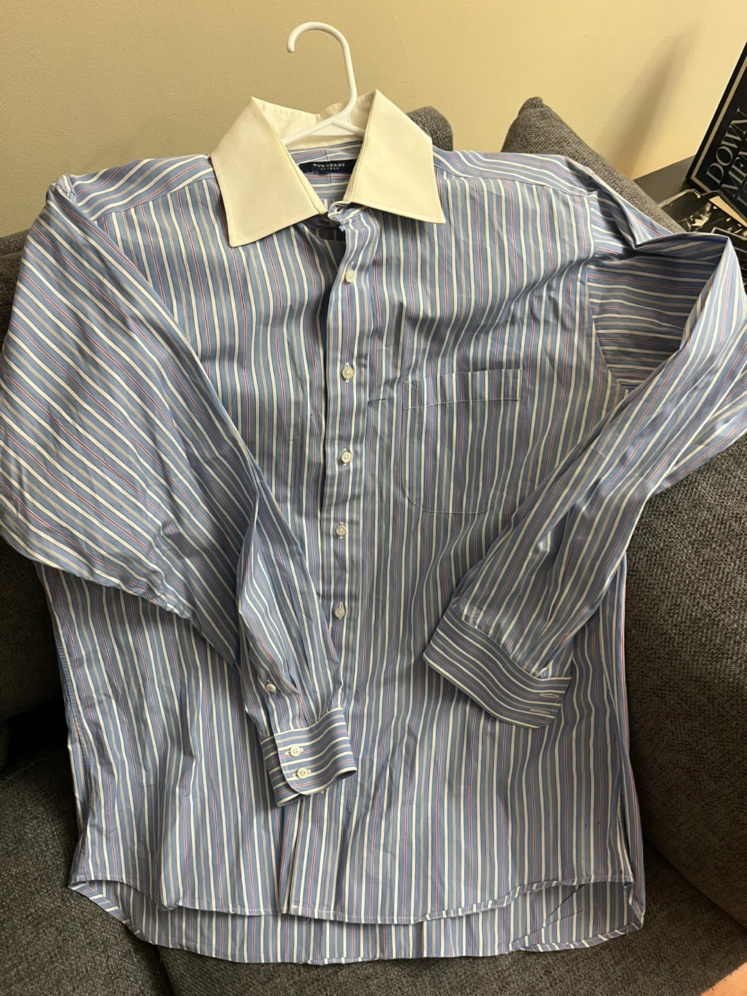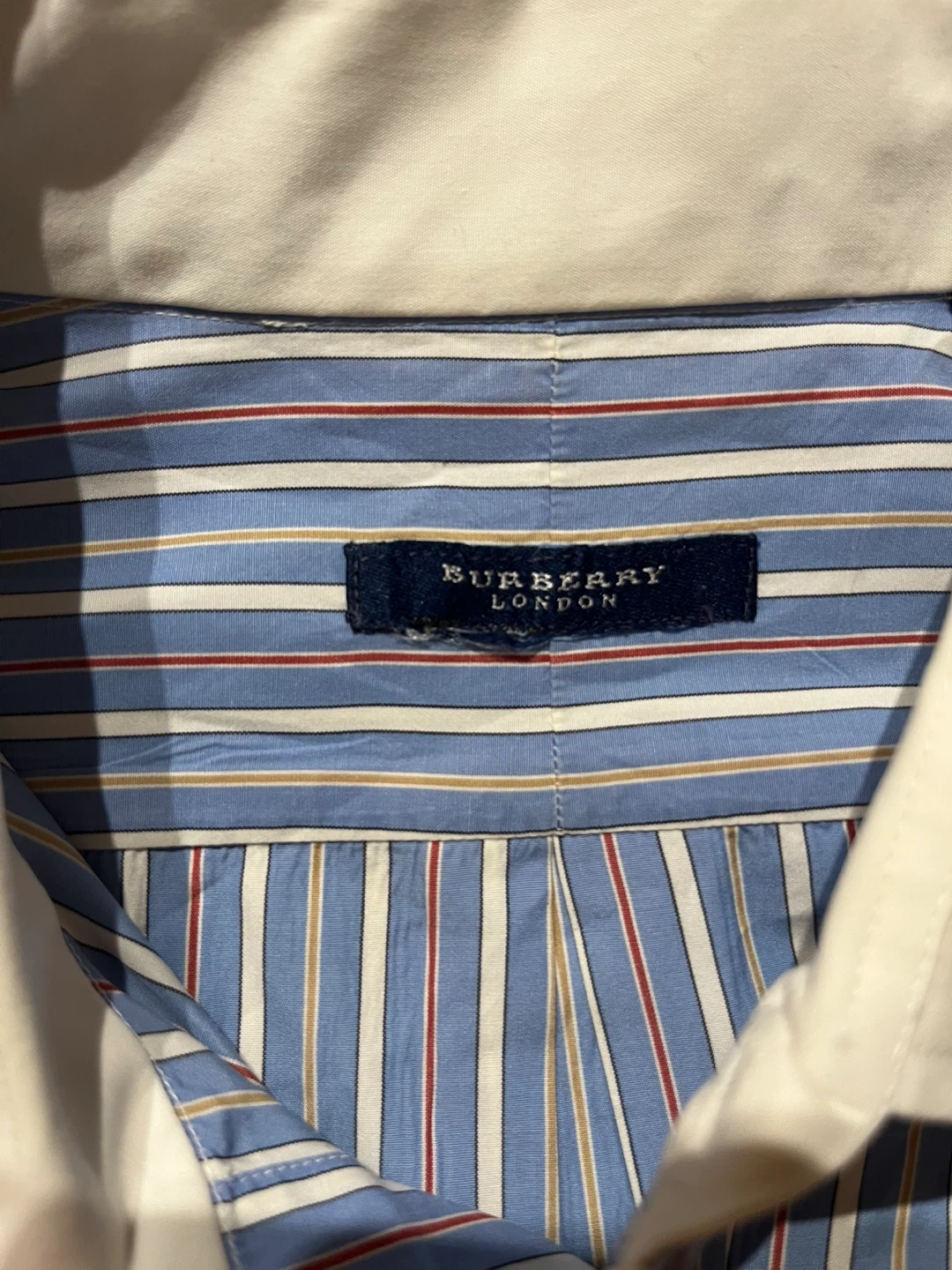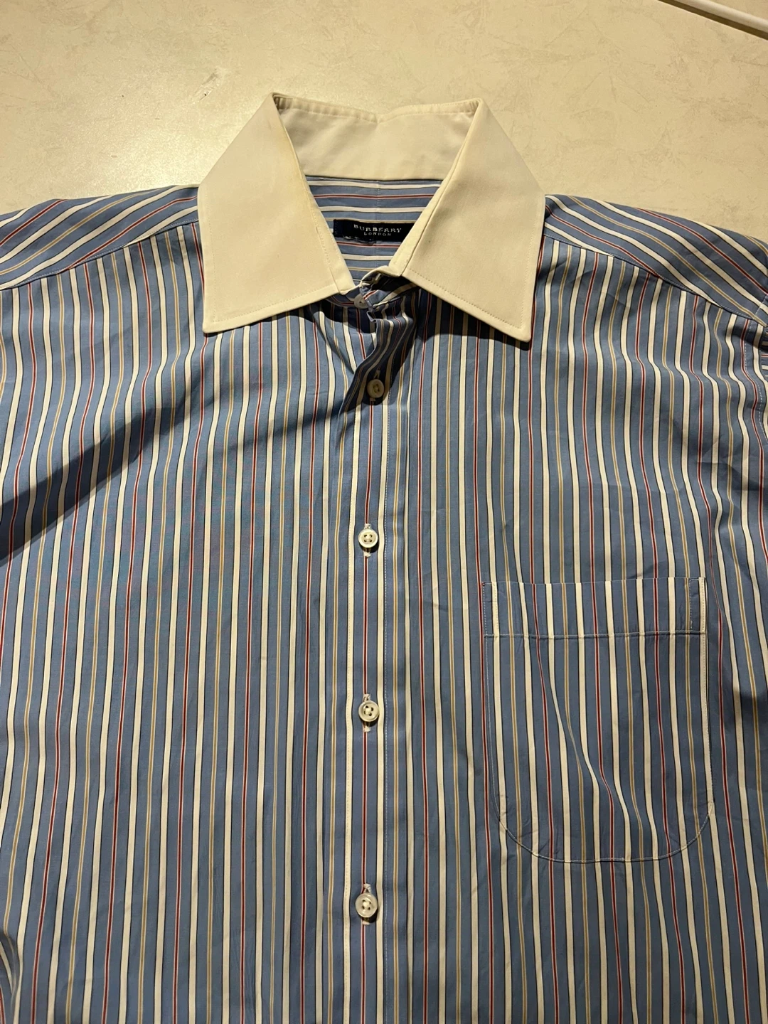 A classic long-sleeved dress shirt from Burberry London. It's a blue pinstripe with white and red accents. Features a contrasting white collar and a chest pocket.