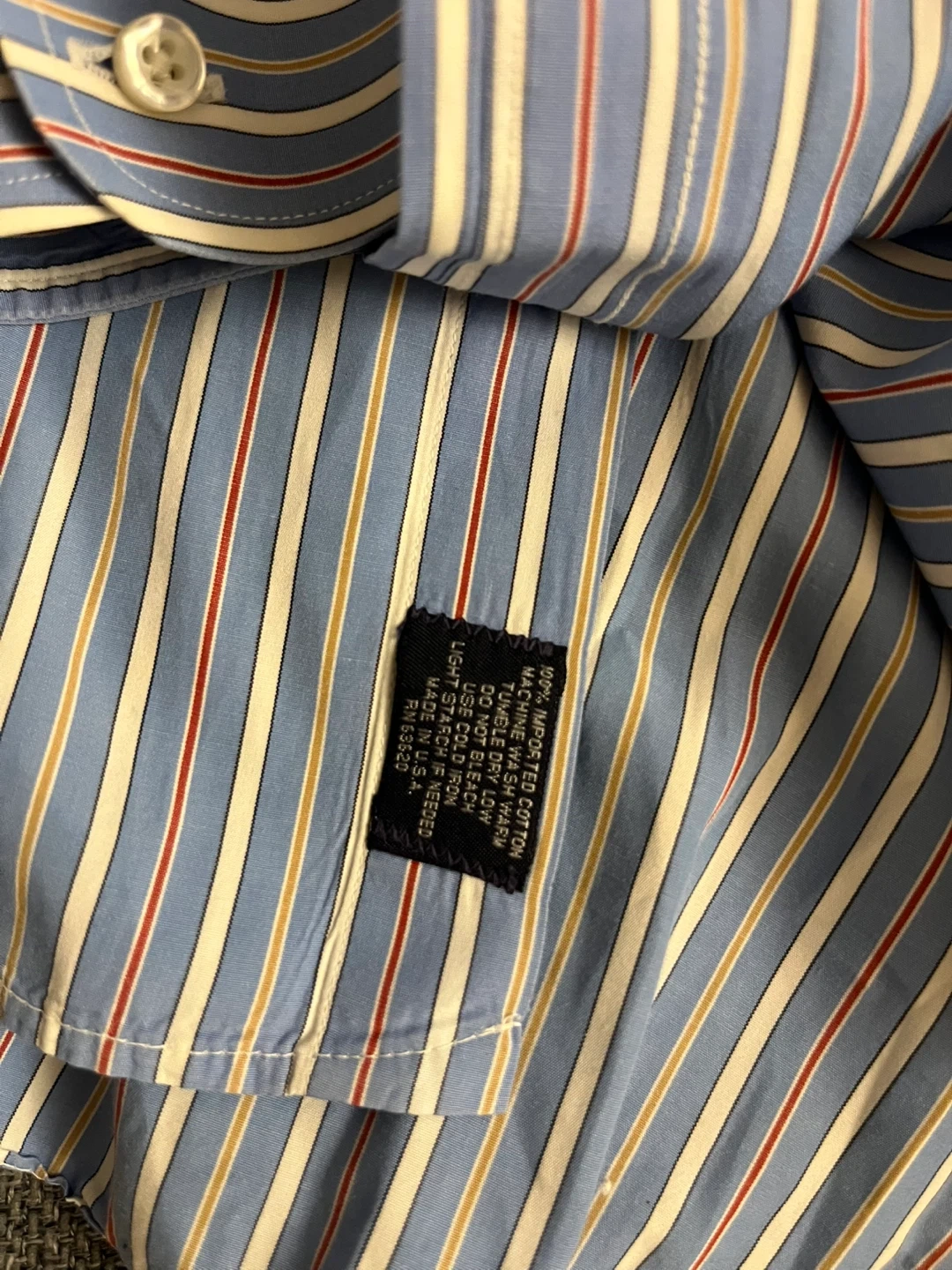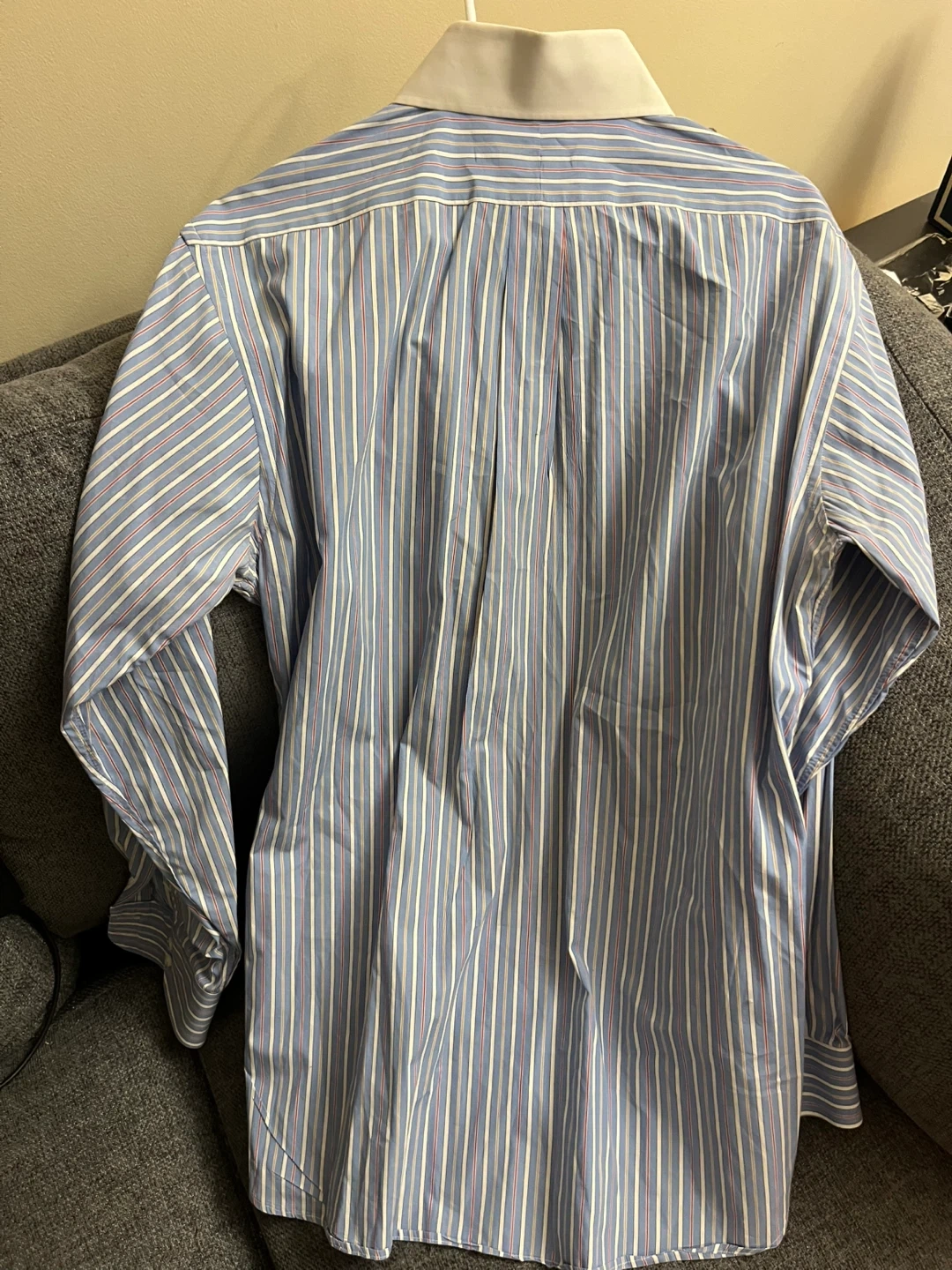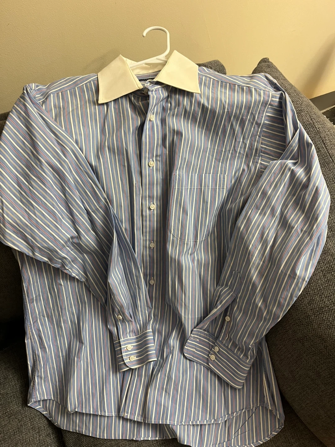A classic long-sleeved dress shirt from Burberry London. It's a blue pinstripe with white and red accents. Features a contrasting white collar and a chest pocket.