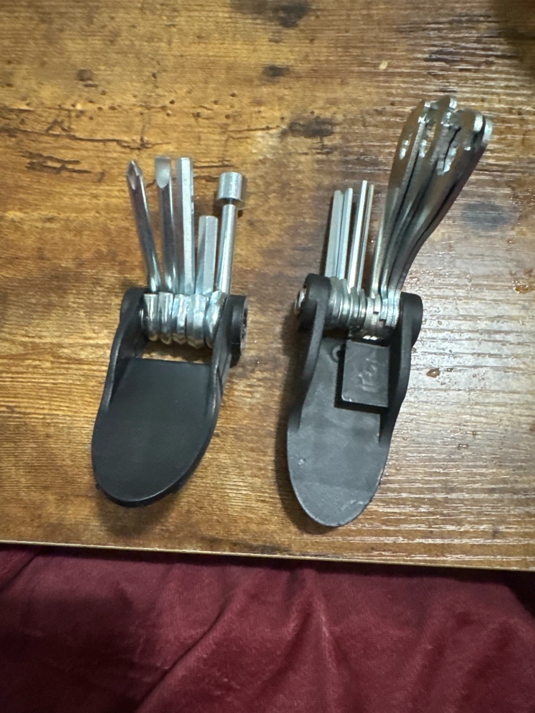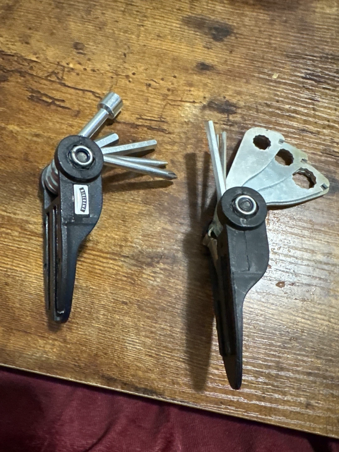 Got two handy multi-tool kits for bike repairs. They're made of metal and plastic. Perfect for roadside fixes and tune-ups!