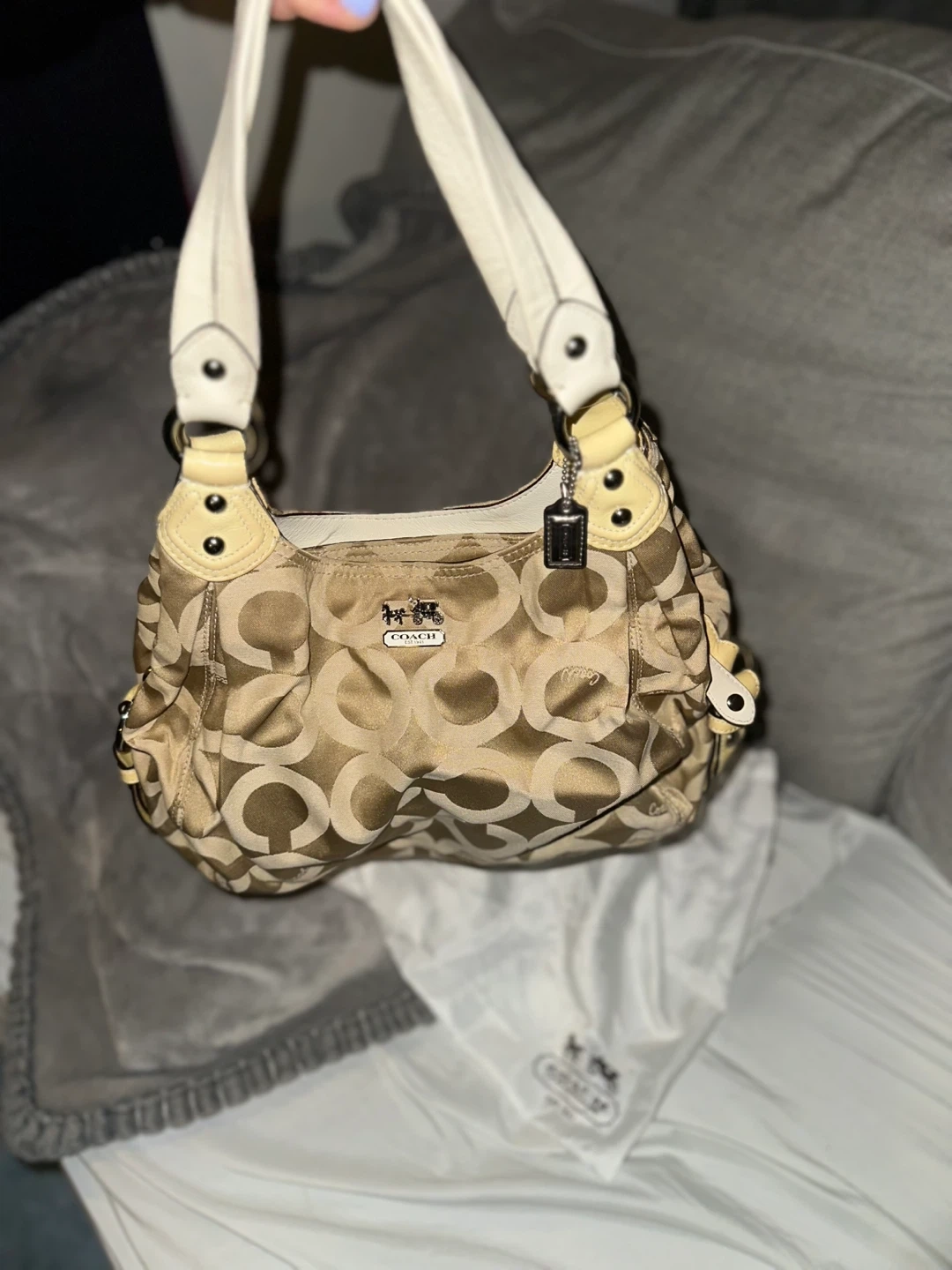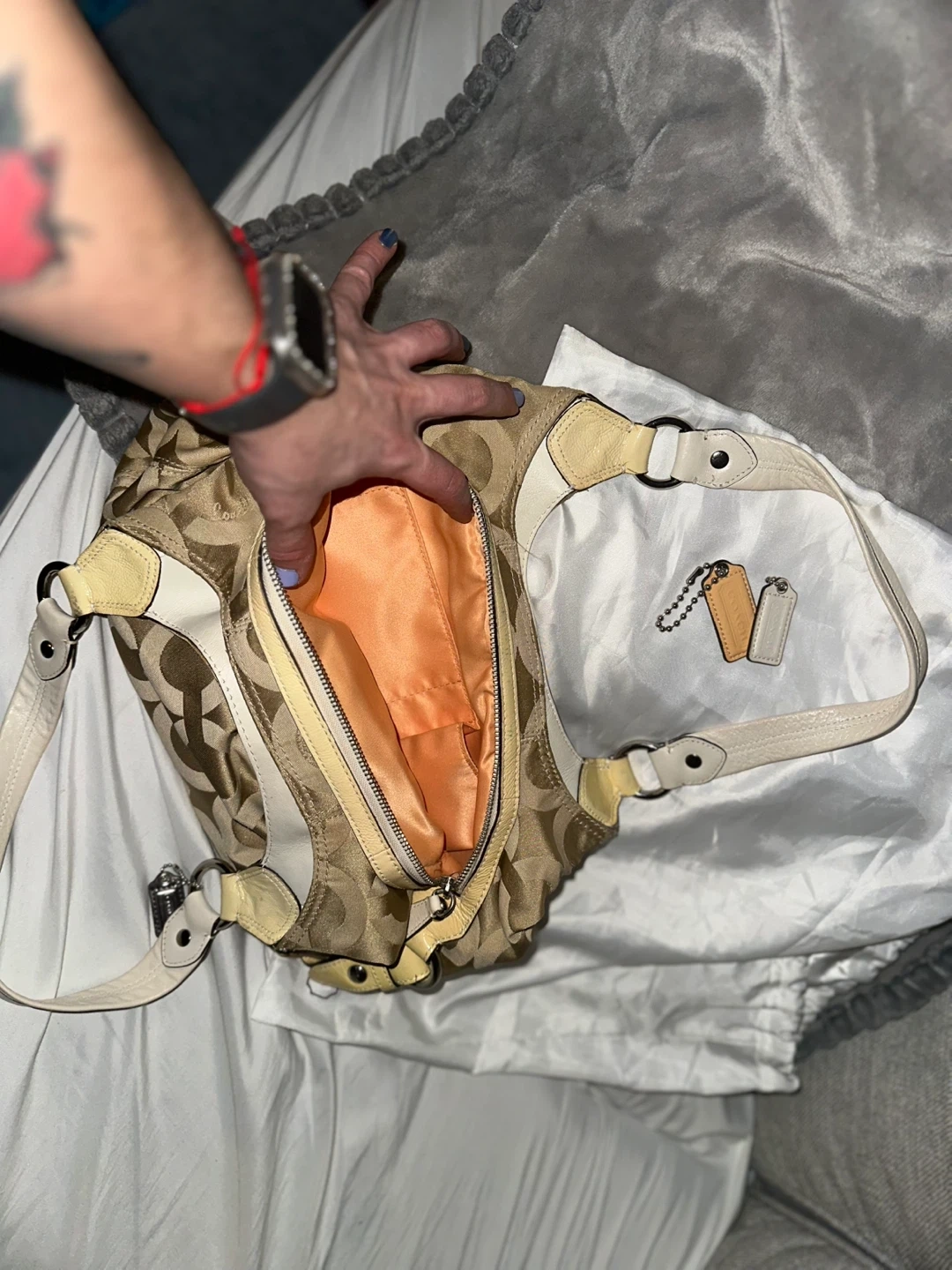 This Coach hobo bag features the signature monogram pattern. It has cream leather accents and a vibrant orange lining. Includes two small leather hang tags. No signs of wear.