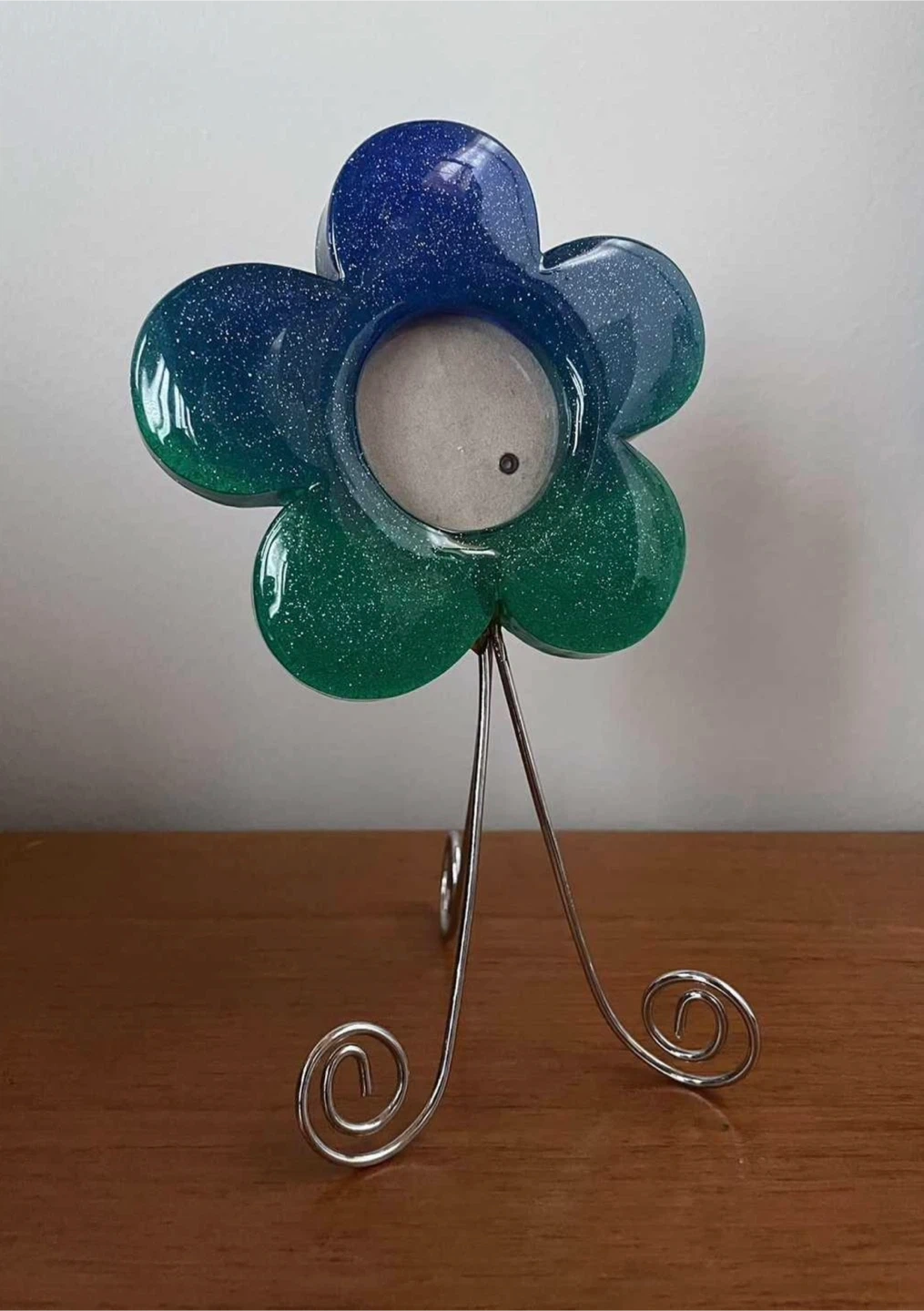 A decorative flower-shaped photo frame with a blue to green gradient. It's made of resin with glitter accents and sits on a metal wire stand. Holds one small photo. I believe it’s from mid 90’s