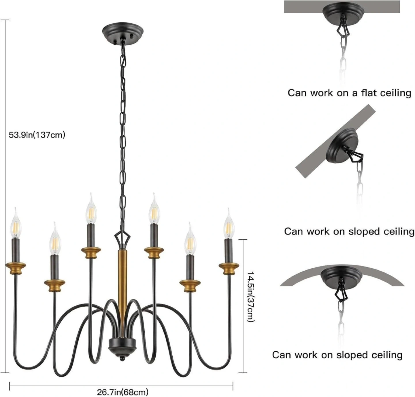 This 6-light chandelier has a black finish with gold accents. It's 26.7 inches wide and 14.5 inches tall, with an adjustable chain for hanging up to 53.9 inches. It works on flat or sloped ceilings.