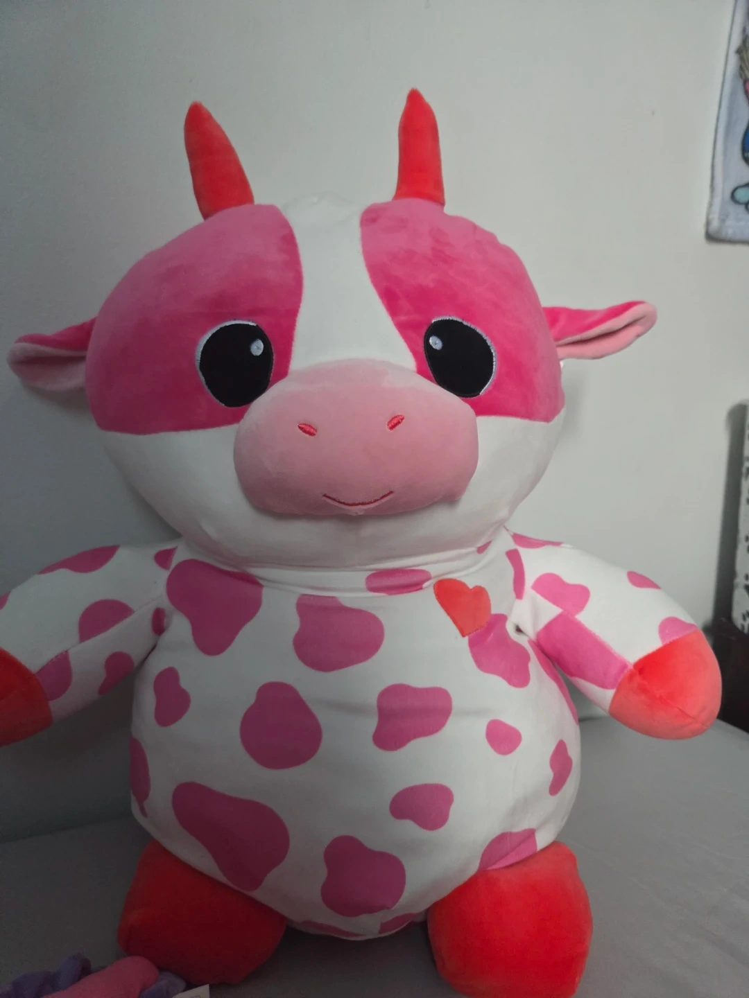 A super soft plush toy shaped like a cow. It's white with pink spots and accents, featuring red horns and hooves. This cuddly friend is ready for hugs!