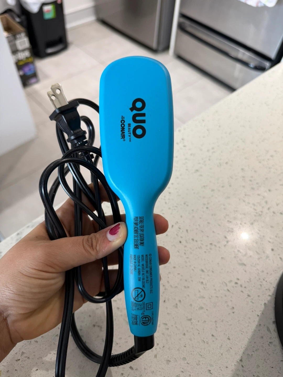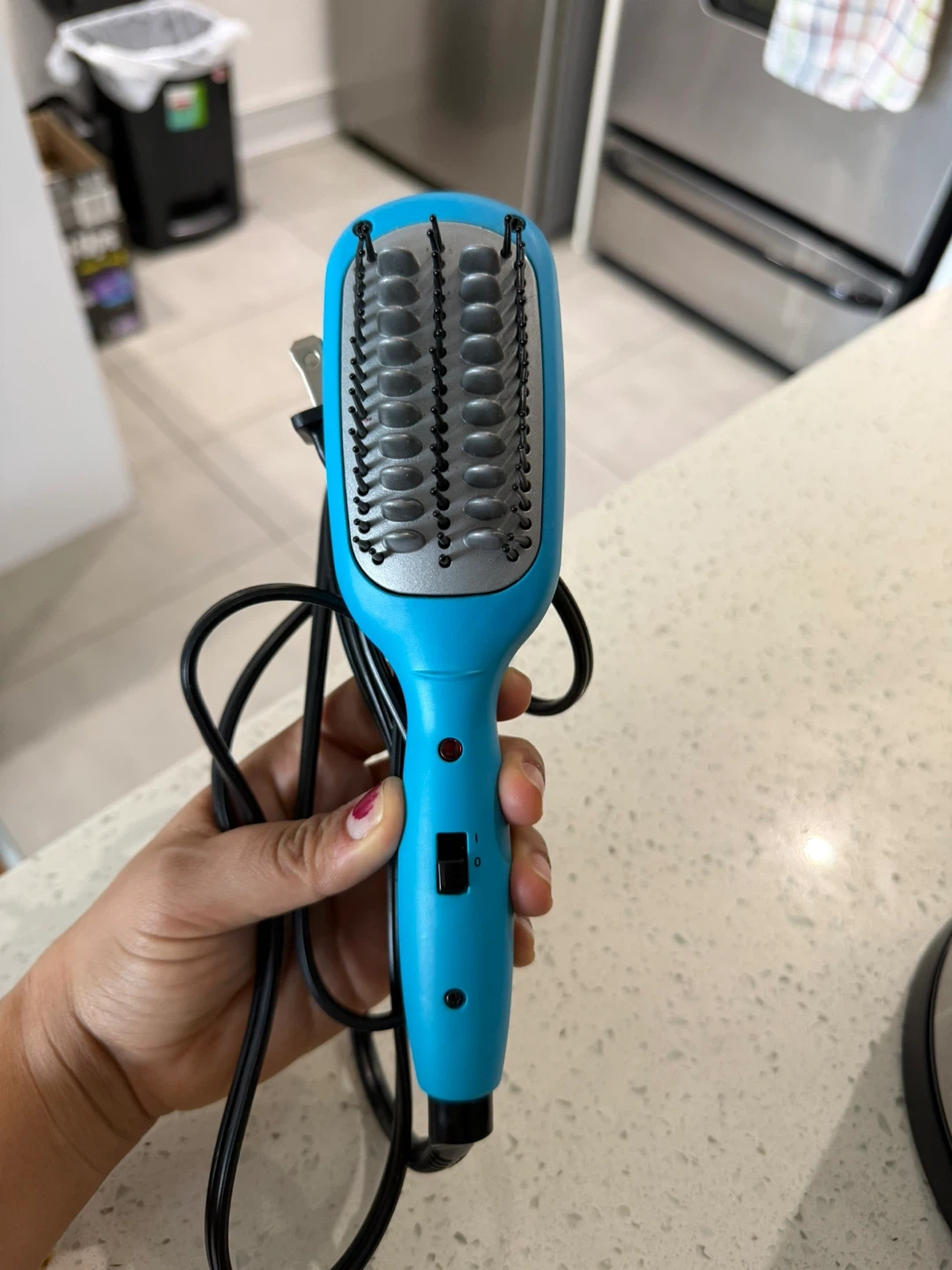 This is a Qo Beauty smoothing brush in blue. It's designed to help straighten and smooth hair. Features a power switch and heat settings.