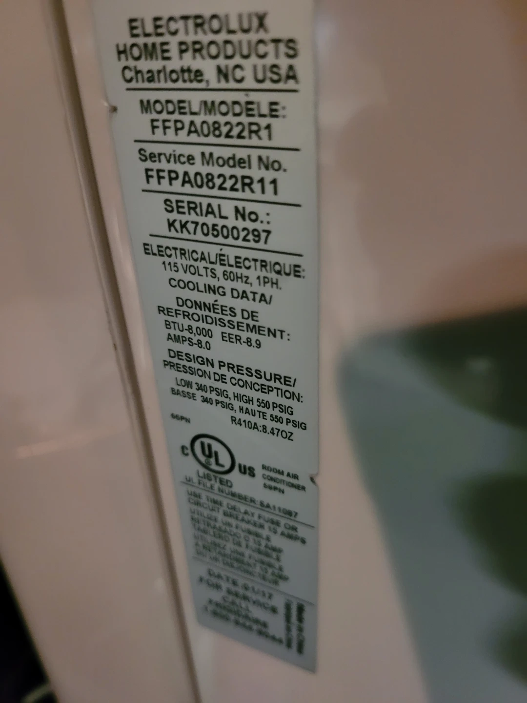 Electrolux portable air conditioner, model FFPA0822R1. It's a 115-volt unit with 8,000 BTU cooling capacity. This unit is ideal for keeping your space cool during warmer months.