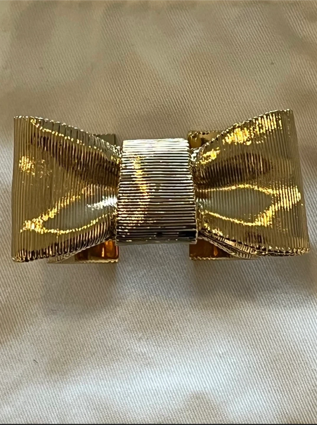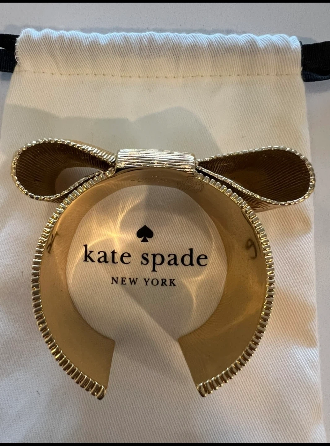 A gold-tone Kate Spade New York cuff bracelet with a bow design. It includes its original dust bag. Measures approximately 2.5 inches in diameter.