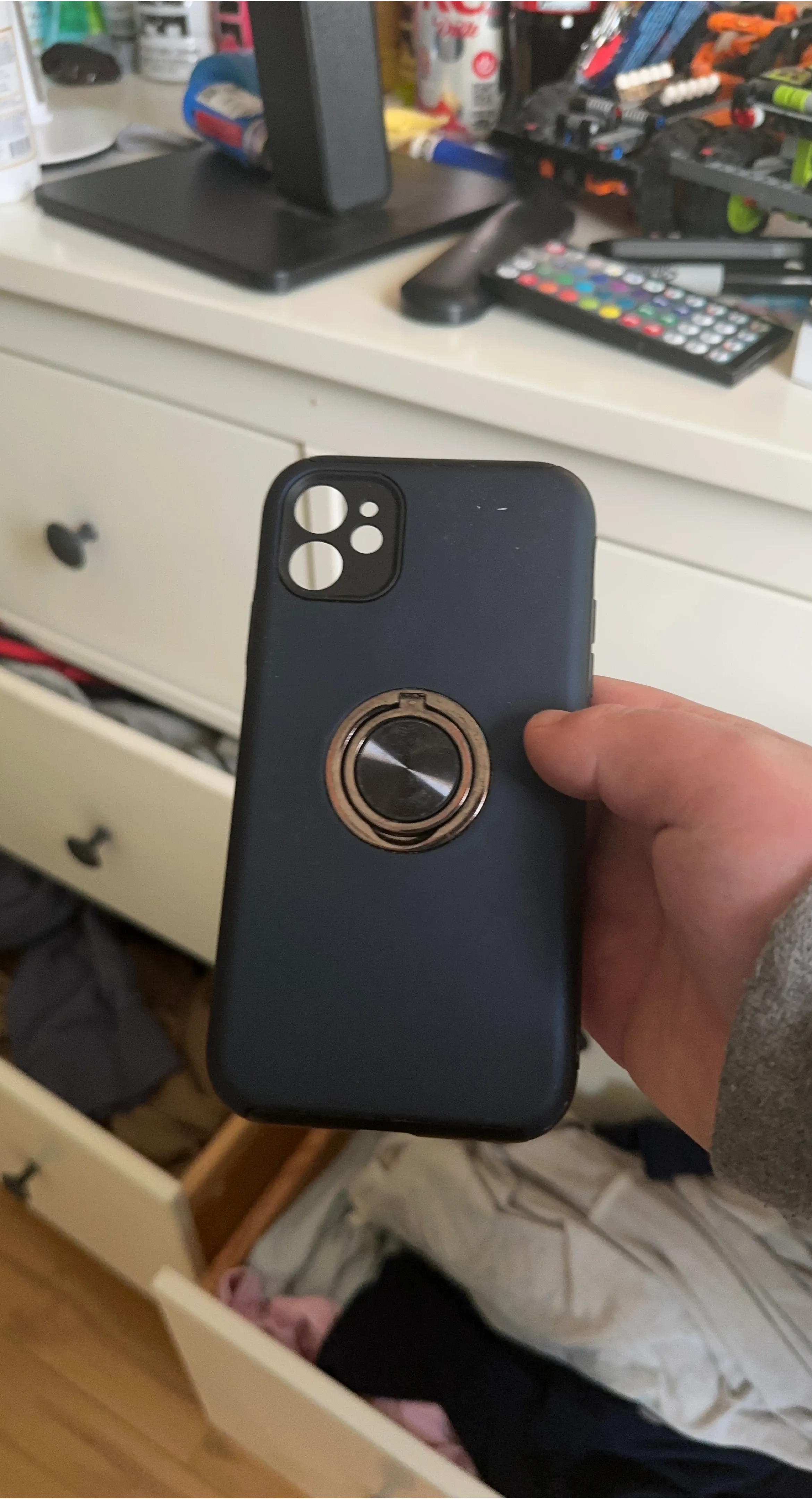 Blue phone case designed for the iPhone 11. It features a built-in ring holder on the back for a secure grip. This case offers protection for your device.