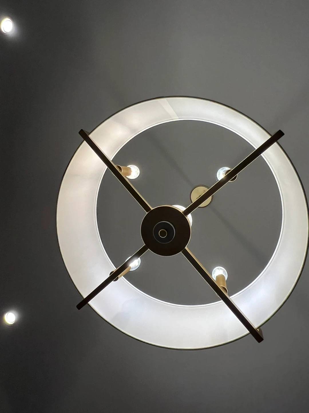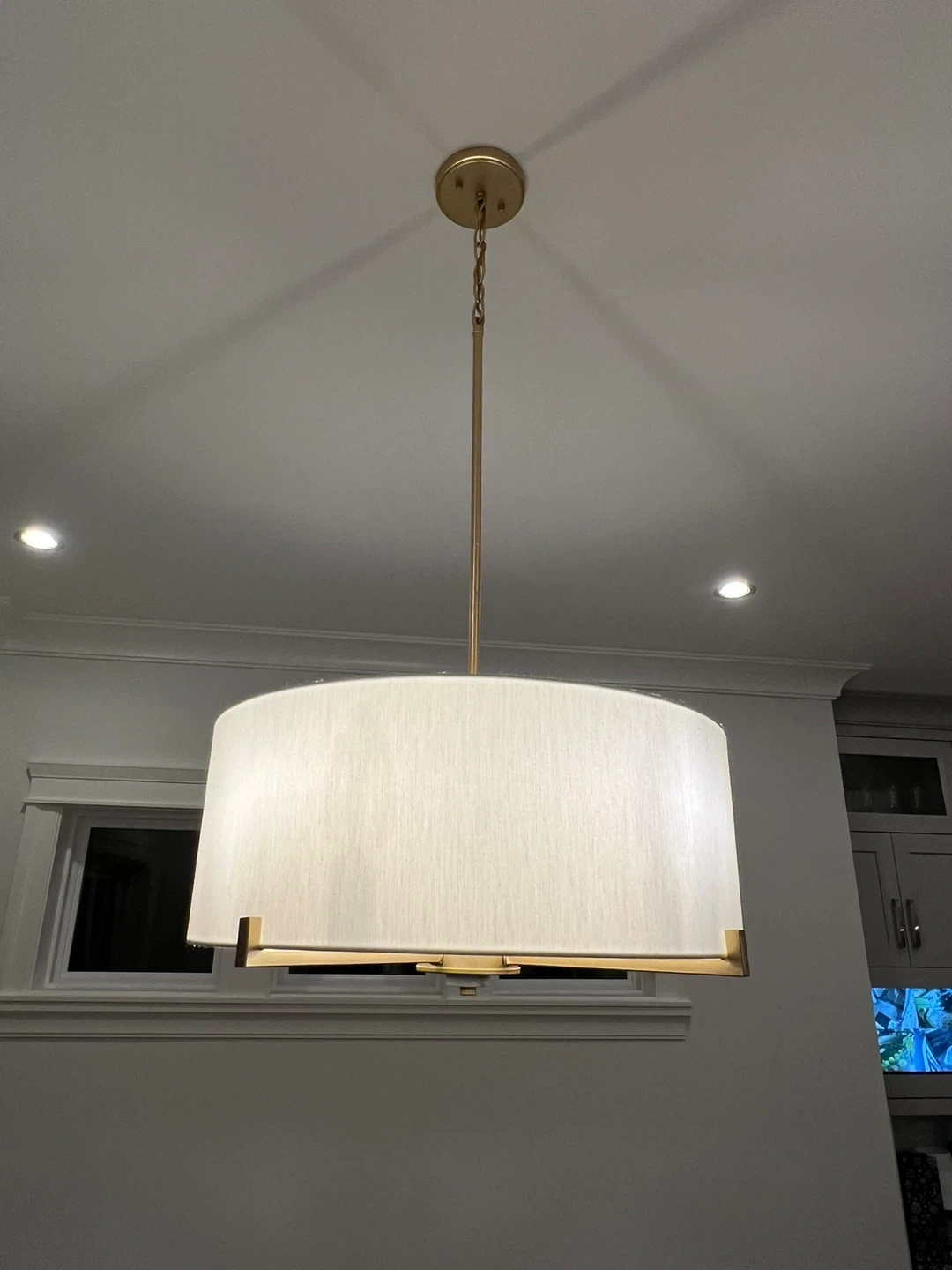 A stylish drum pendant light fixture with a white fabric shade. It features a modern design with brushed gold accents. This fixture would be a lovely addition to a dining room or living area.
