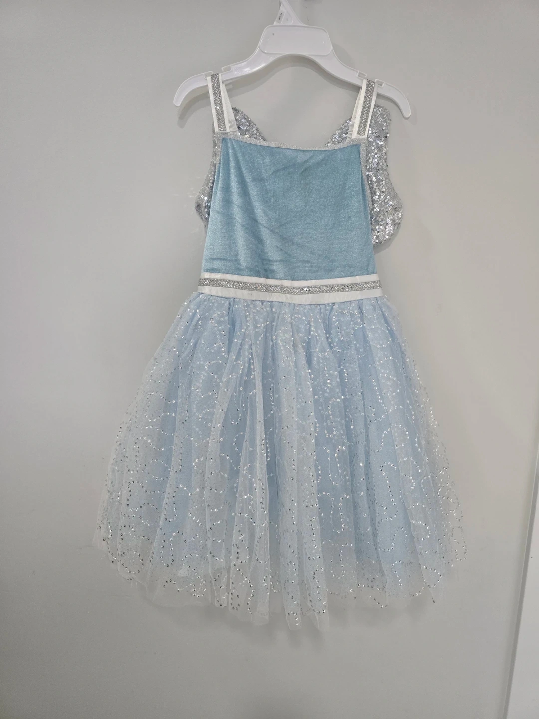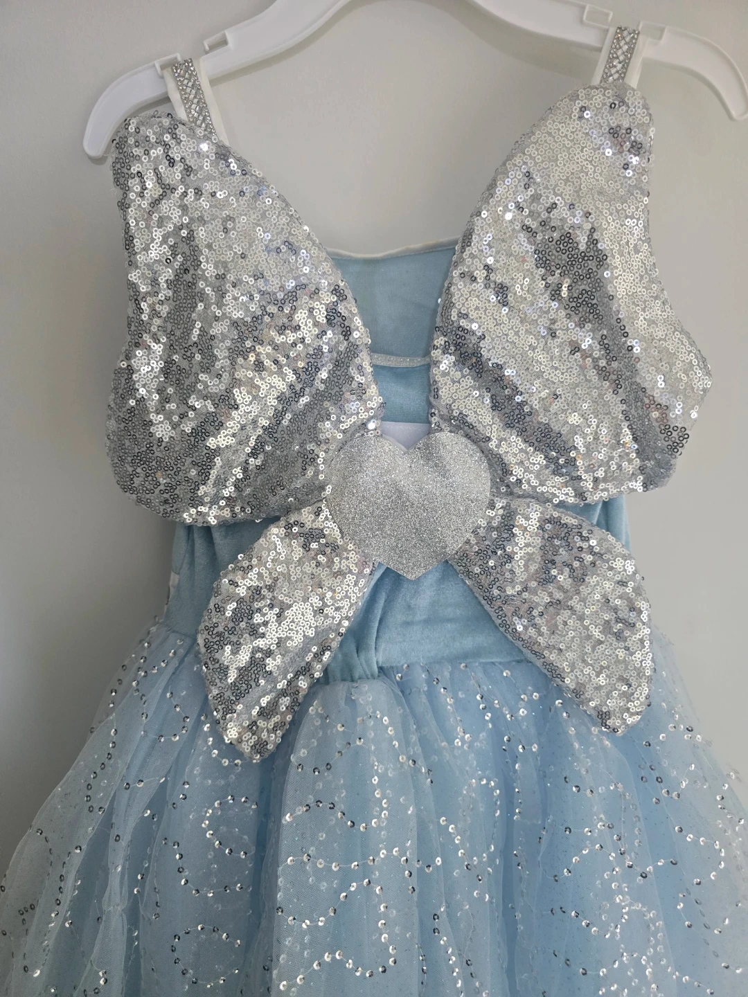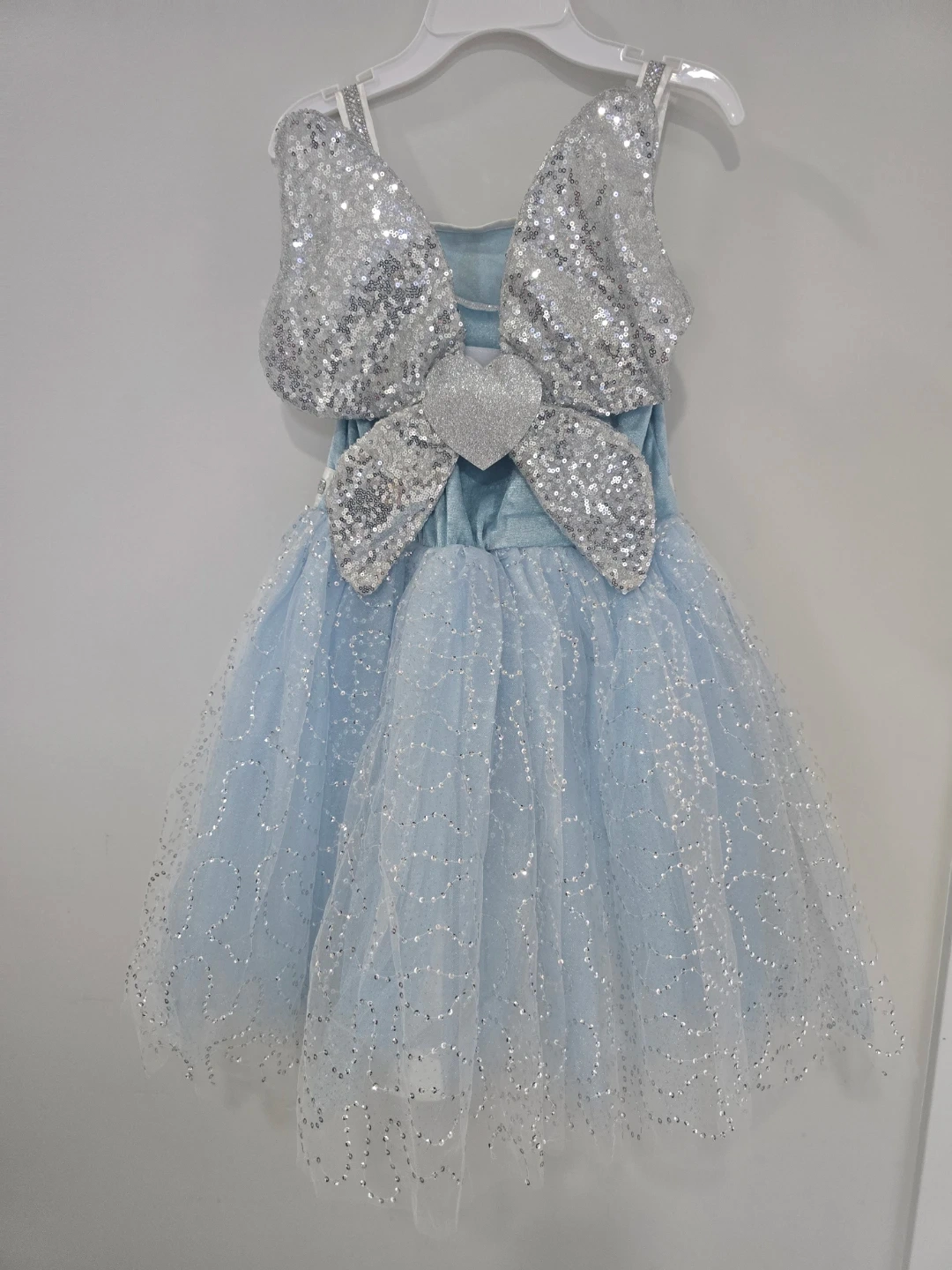 This adorable blue fairy costume dress features a velvet bodice with sparkly straps. It's adorned with shimmering silver sequins on the large bow and heart detail at the back. The layered tulle skirt is also sprinkled with glitter for an extra touch of magic. Perfect for dress-up or parties!
