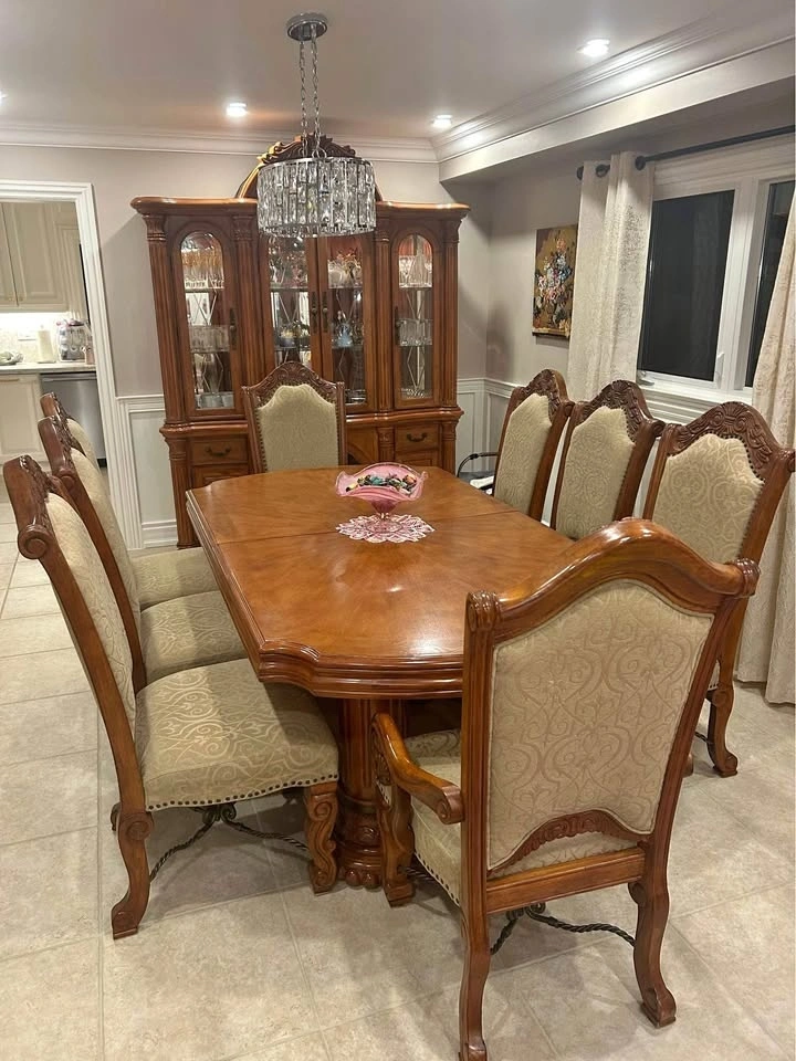 Beautiful wood and iron dining room set with 8 captain's chairs. The table measures 47 inches wide by 85 inches long at its smallest, and includes two 18-inch leaves to extend it. The hutch measures 75 inches wide, 94 inches high, and 19 inches deep, with touch-activated lighting. The set is in very good condition.