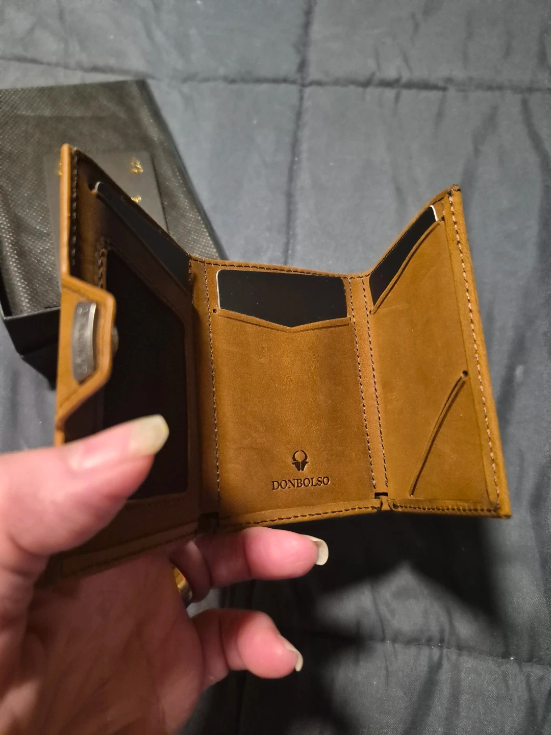 This is a Donbolso Wallety NextGen wallet. It's made with brown suede-like material and features multiple card slots and a coin compartment. Includes original box and instructions.