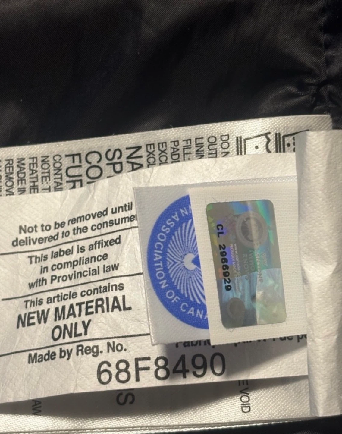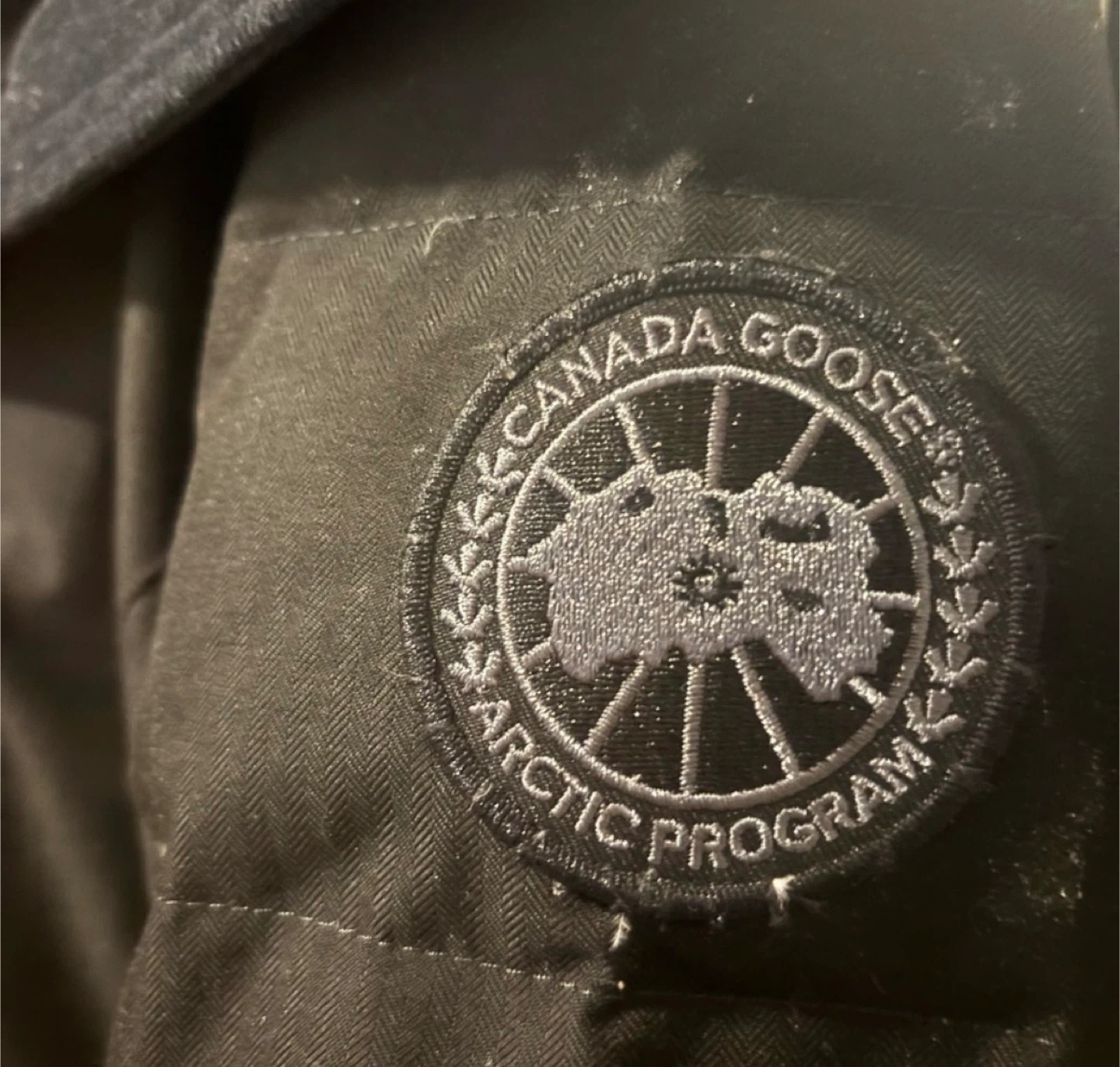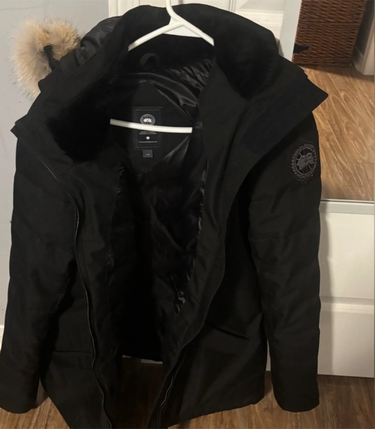 Canada Goose down-filled parka in black. Style is 2885, model name is Mystique. It's a size large and features chevron quilting. Fur-lined hood for extra warmth. This costs around $1k+
