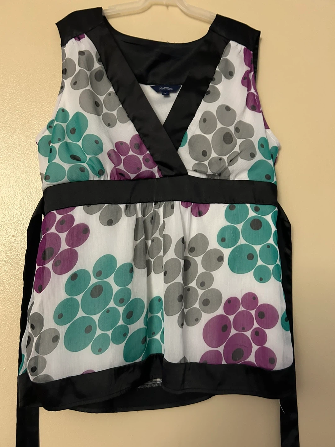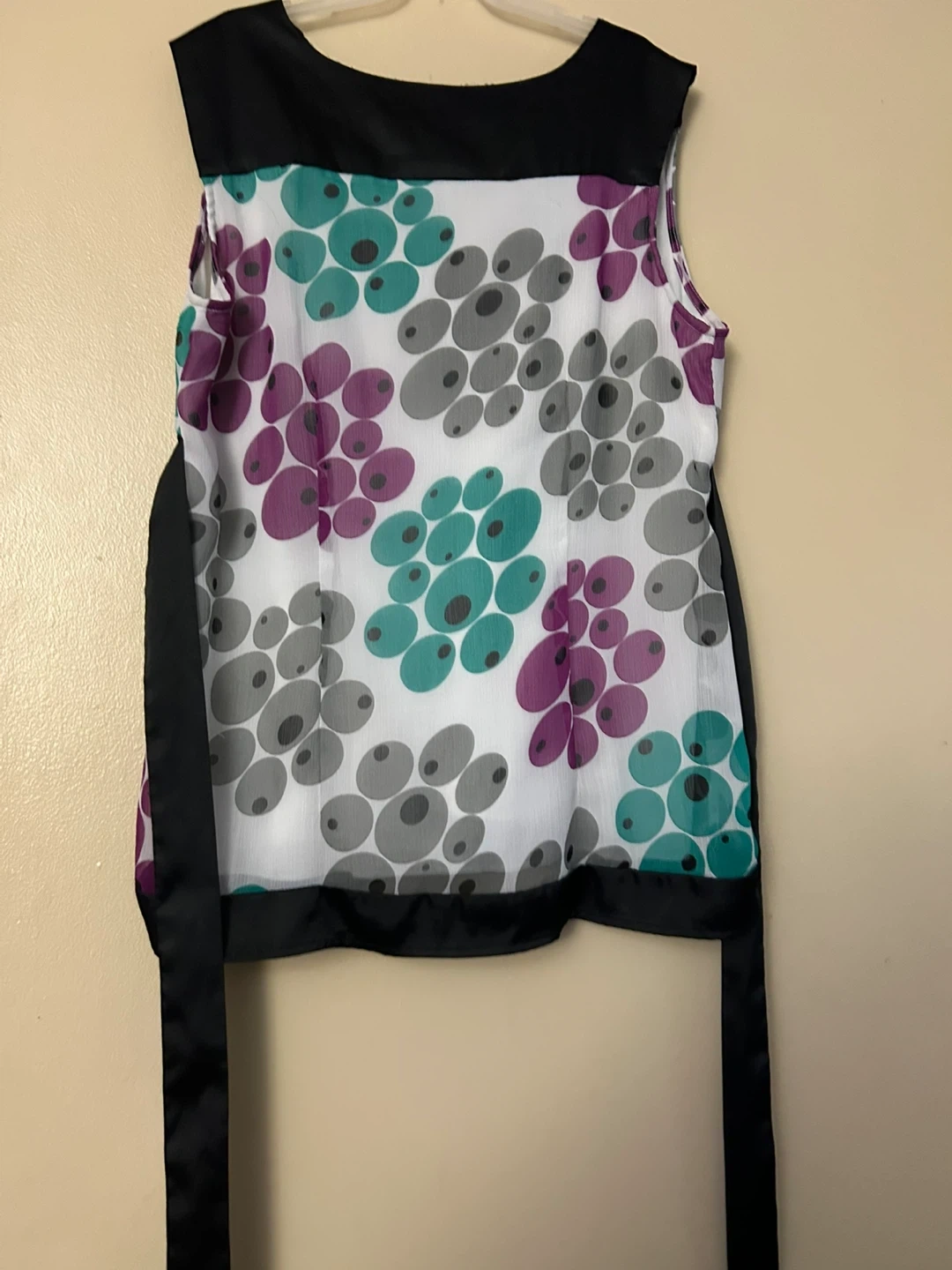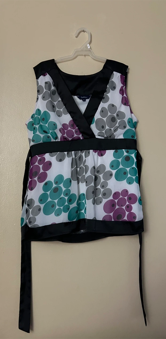 Beautiful Reitmans Medium Blouse {white with black belt & grey, green & purple polka dots. Pickup from smoke free home near Morningstar Drive (Mississauga) & Humberwood Blvd (Toronto) in Malton. Willing to meet at 4369 Brandon Gate Dr, Mississauga with enough notice.