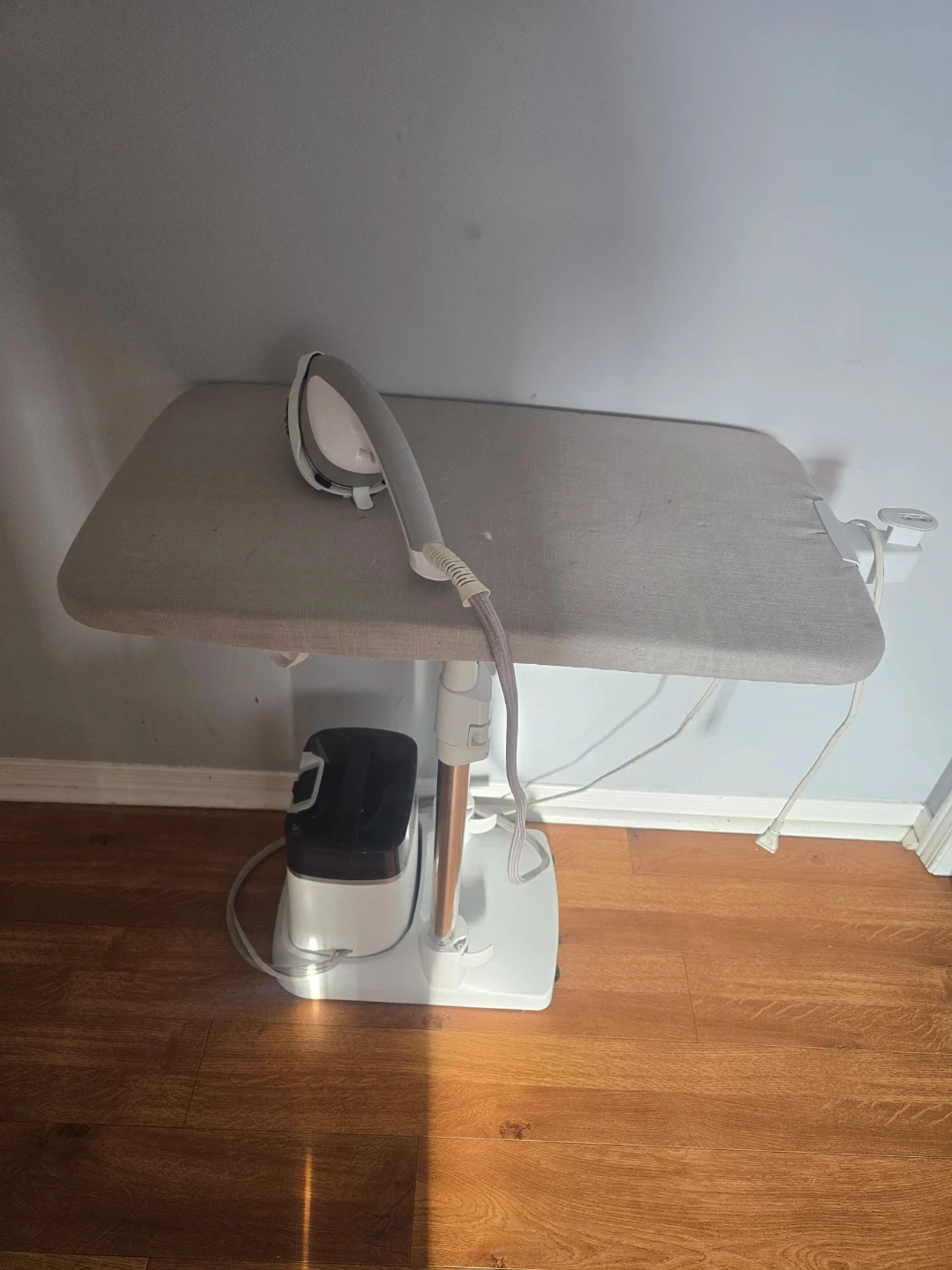 This Rowenta IXEO steamer and ironing board combo is ready for use. It heats up in 45 seconds and has a 1-liter water capacity. The adjustable board allows for vertical steaming or horizontal ironing.