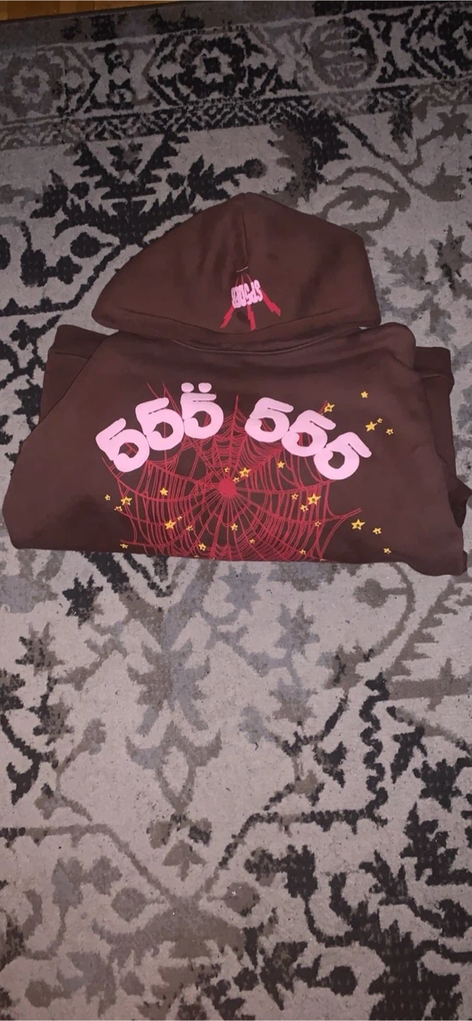 Brown hoodie with spiderweb graphic and "555" text. It's a pullover style with a hood. This item is great for casual wear. Heavy and good qaulity came in wrong size just wanna get rid of it