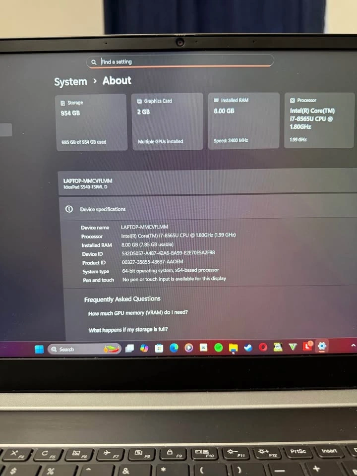 Selling my Lenovo IdeaPad S540 laptop with a 15.6-inch anti-glare display. It features an Intel i7 8th gen CPU, 8 GB of RAM (extendable), and an MX 250 graphics card with 2GB of video memory, great for gaming and video editing. It also has a 1TB SSD (extendable), a backlit keyboard, and a fingerprint scanner. Comes with a 65-watt charger and Windows 11. I'm selling it because I upgraded to a MacBook.