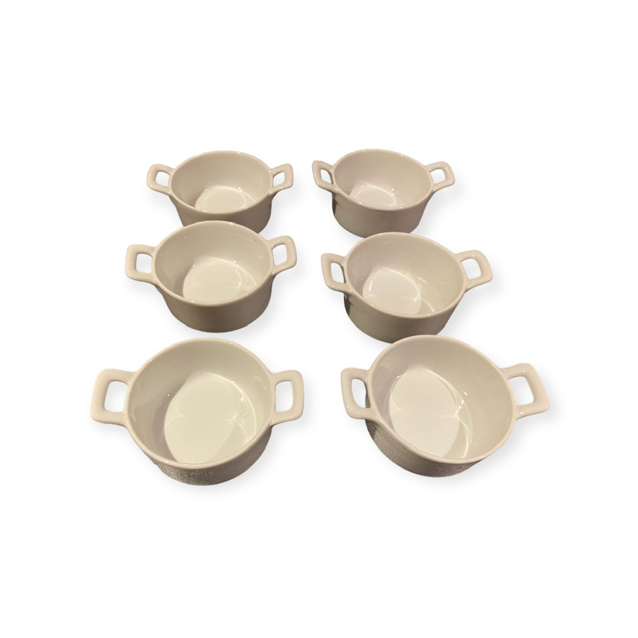 6 brand new small porcelain bowls with double handles for sale. (Brand: stokes)