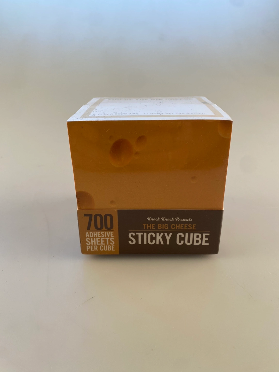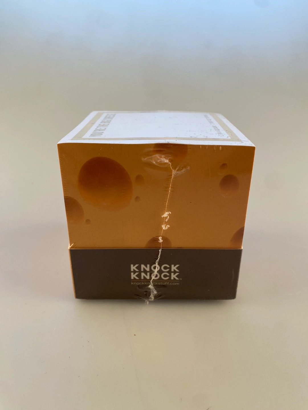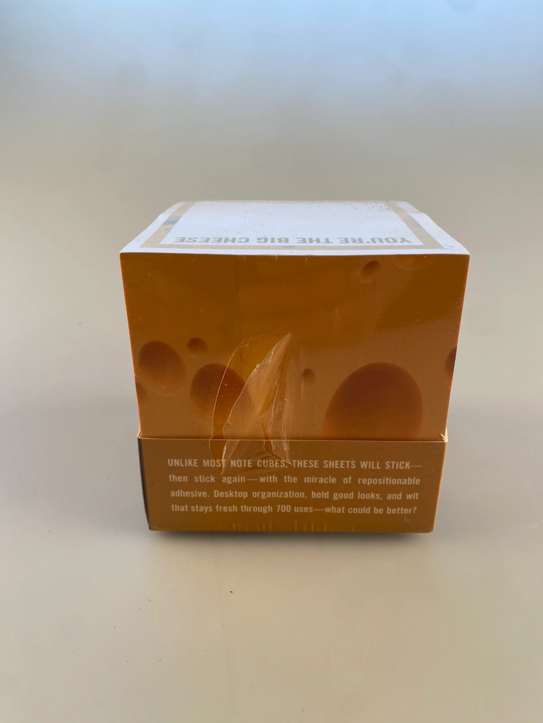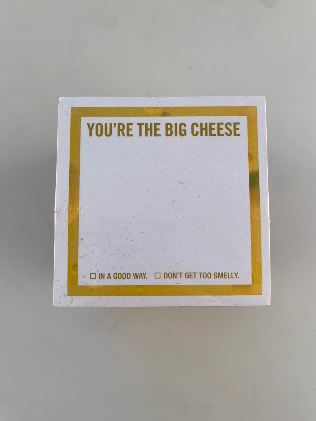 Cheesy right?! This yellow & white cheese themed cube of sticky notes say “YOU ’RE THE BIG CHEESE” on the top and has two boxes that you can tick in small print on the bottom: “IN A GOOD WAY” and “DON’T GET TOO SMELLY”. Comes with 700 adhesive sheets. Measures 3.375” x 3.375” square. Made by Knock Knock. New, but there’s a tiny rip in the cellophane.