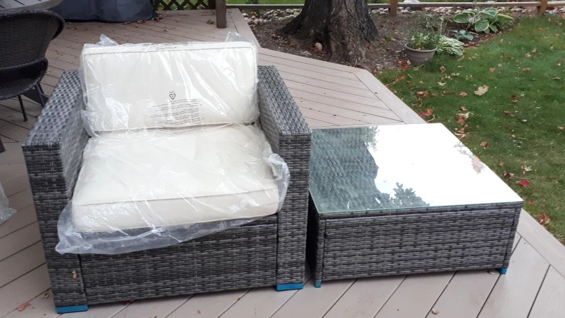 2 Piece patio set for balcony or small space Includes 1 chair and 1 glass top table that convertible to an ottoman