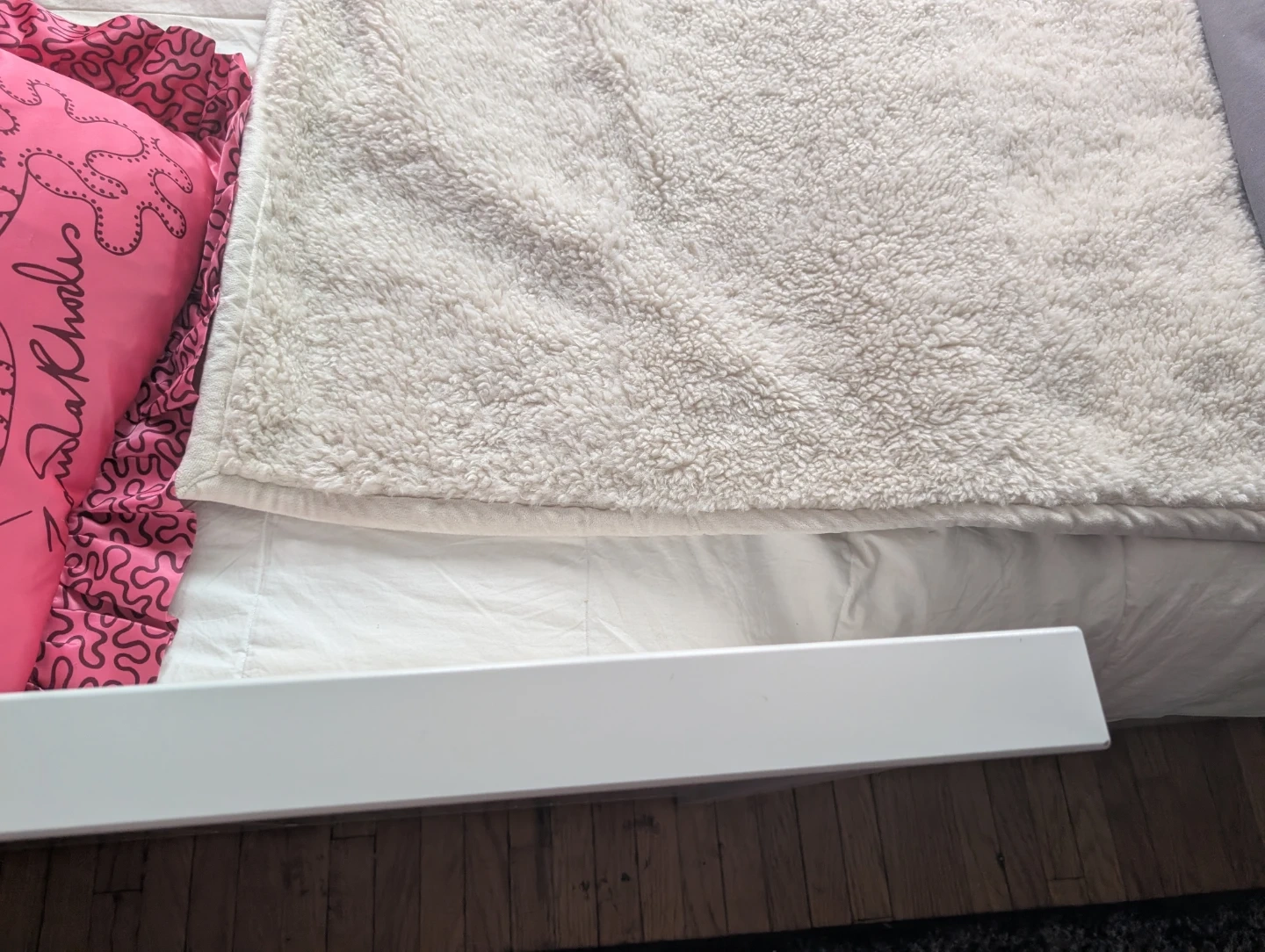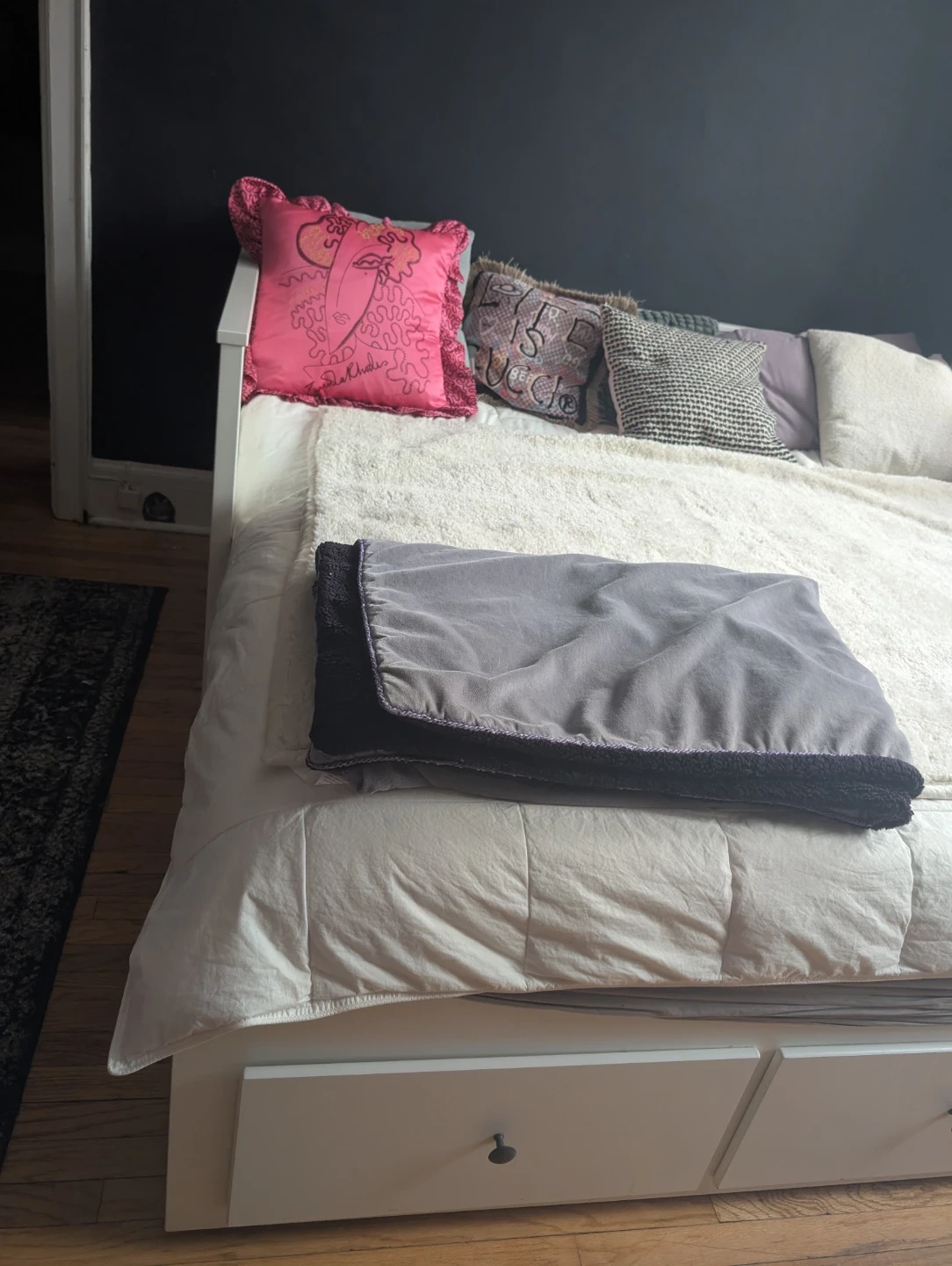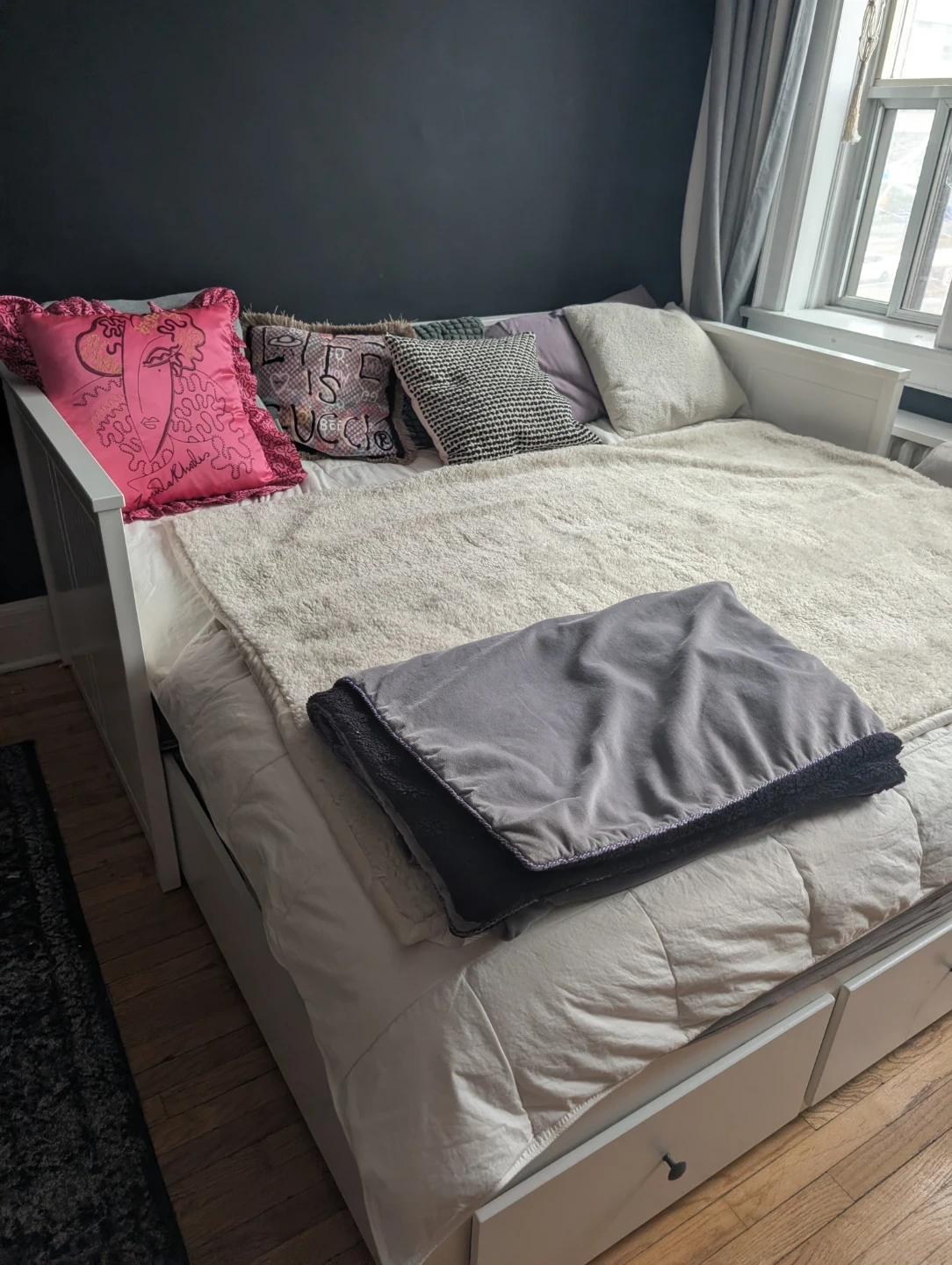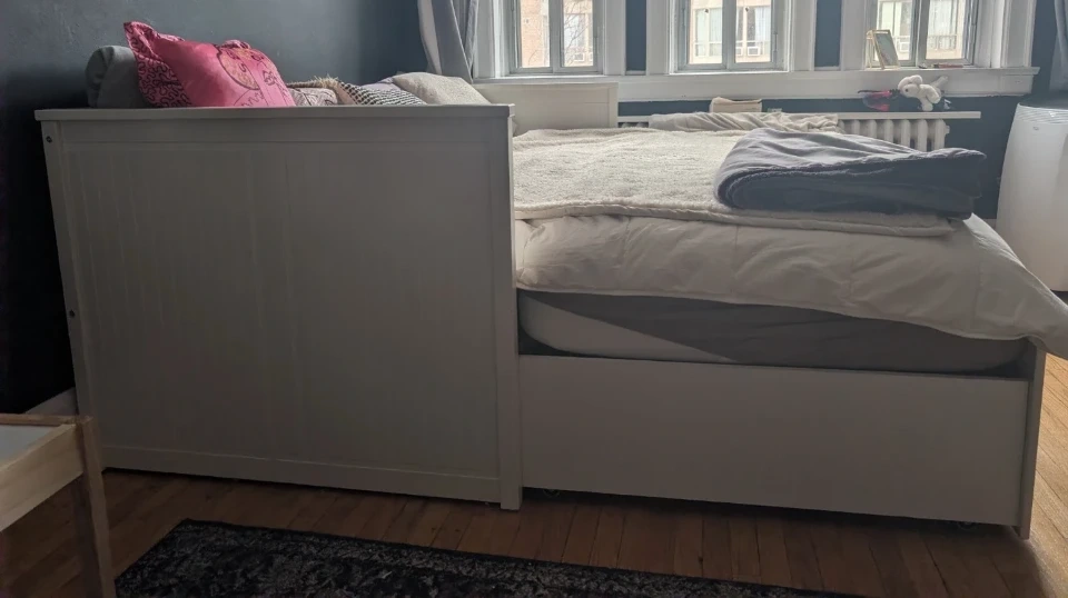 Selling a Hemnes white daybed that's in very good condition! We have disassembled it for easy pickup. It features convenient drawers underneath for lots of extra storage. slight scratches on one side of the bed. Other than that it looks great, works great, drawers pull out smoothly. To be completed with two twin sized mattresses. Thin mattresses are needed if you ant to close the bed up and use it as seating.