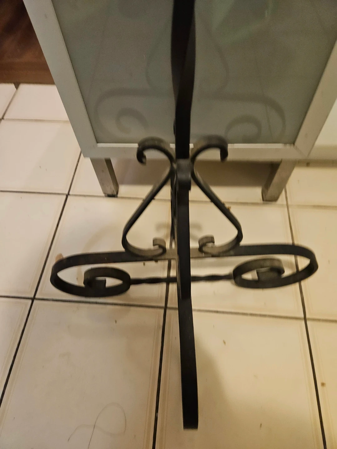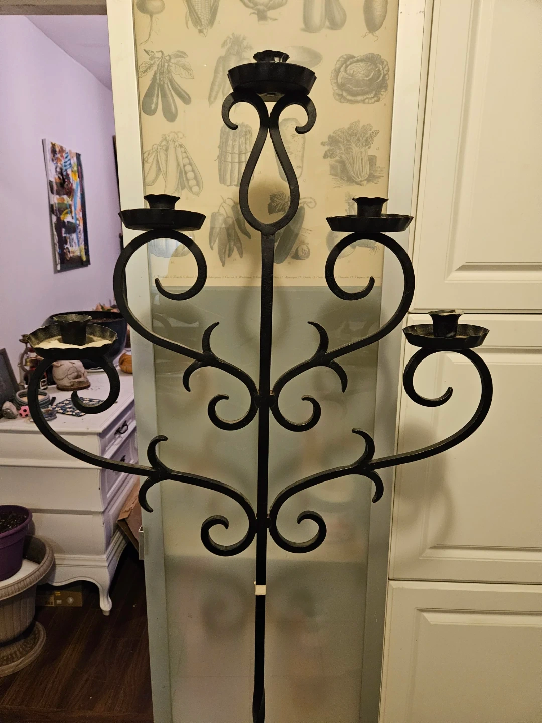 This tall floor candelabra has a decorative wrought iron style. It holds five candles, with three on one side and two on the other. It's a statement piece for any room!asking 80.00 OBO