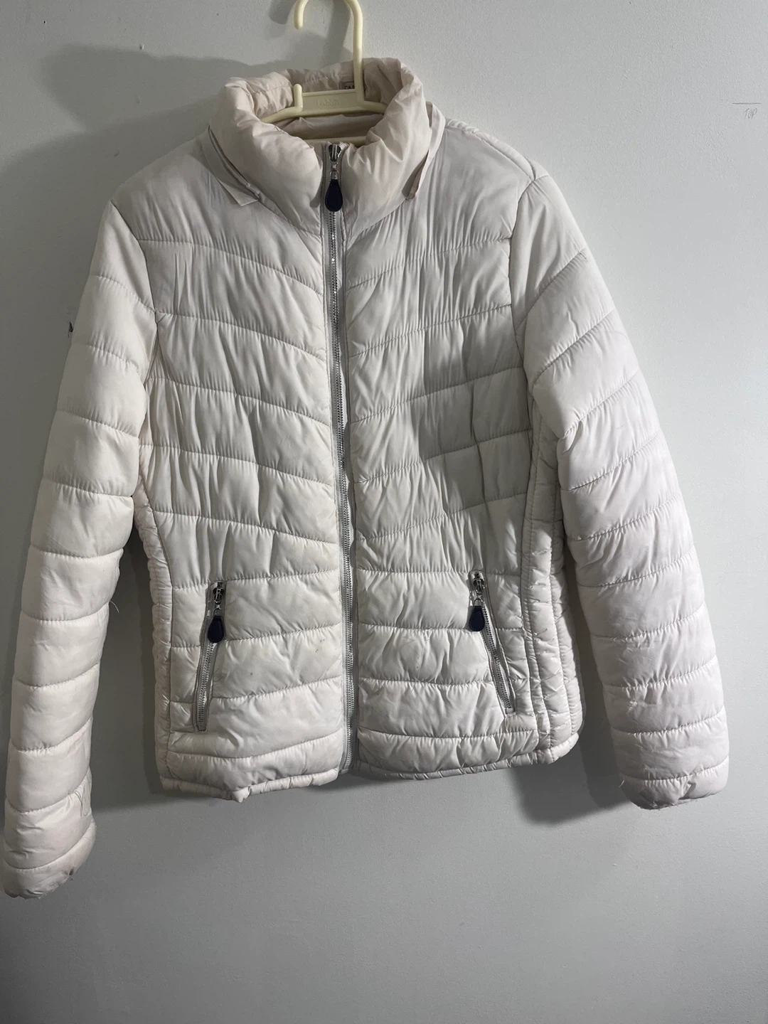 This is a white puffer jacket with a full zip closure and two zippered pockets. It's a warm and stylish outerwear option for cooler weather.
