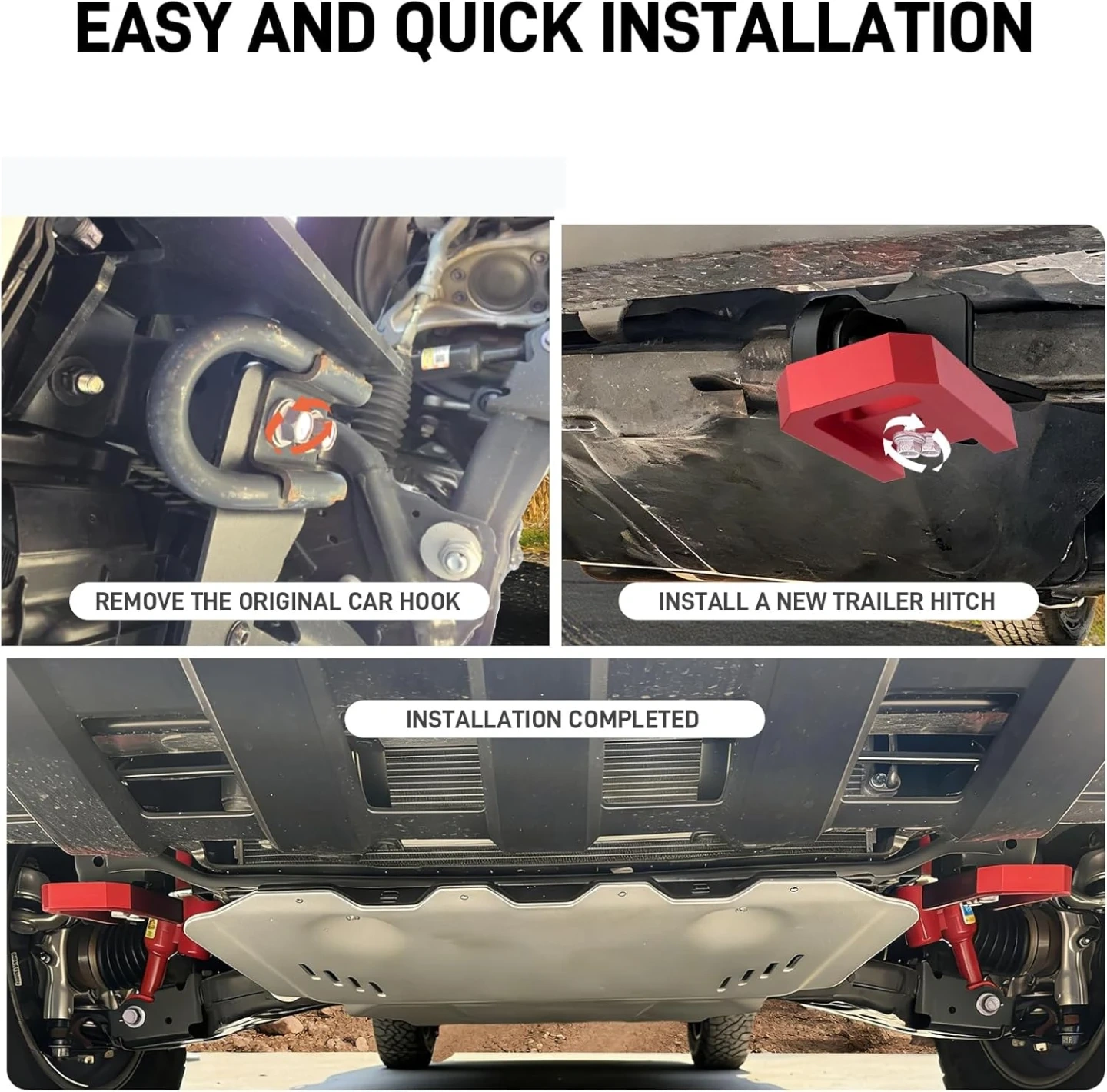 [Easy & Quick Installation] No drilling or complicated tools required,Simply remove the bolts from the two original tow hooks, replace them with the new tow hooks, and tighten with the factory original bolts to complete the installation.