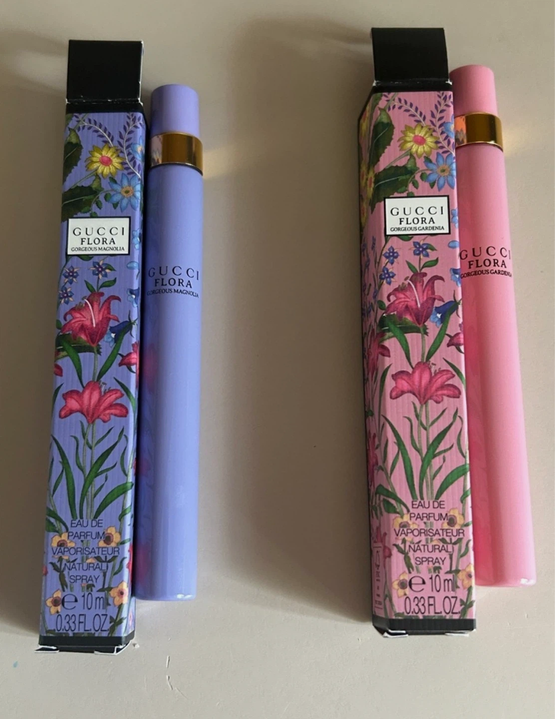Two NEW Gucci Flora perfumes: Gorgeous Gardenia and Gorgeous Magnolia. Each is a 10ml natural spray Eau de Parfum. Perfect for travel or sampling these scents!