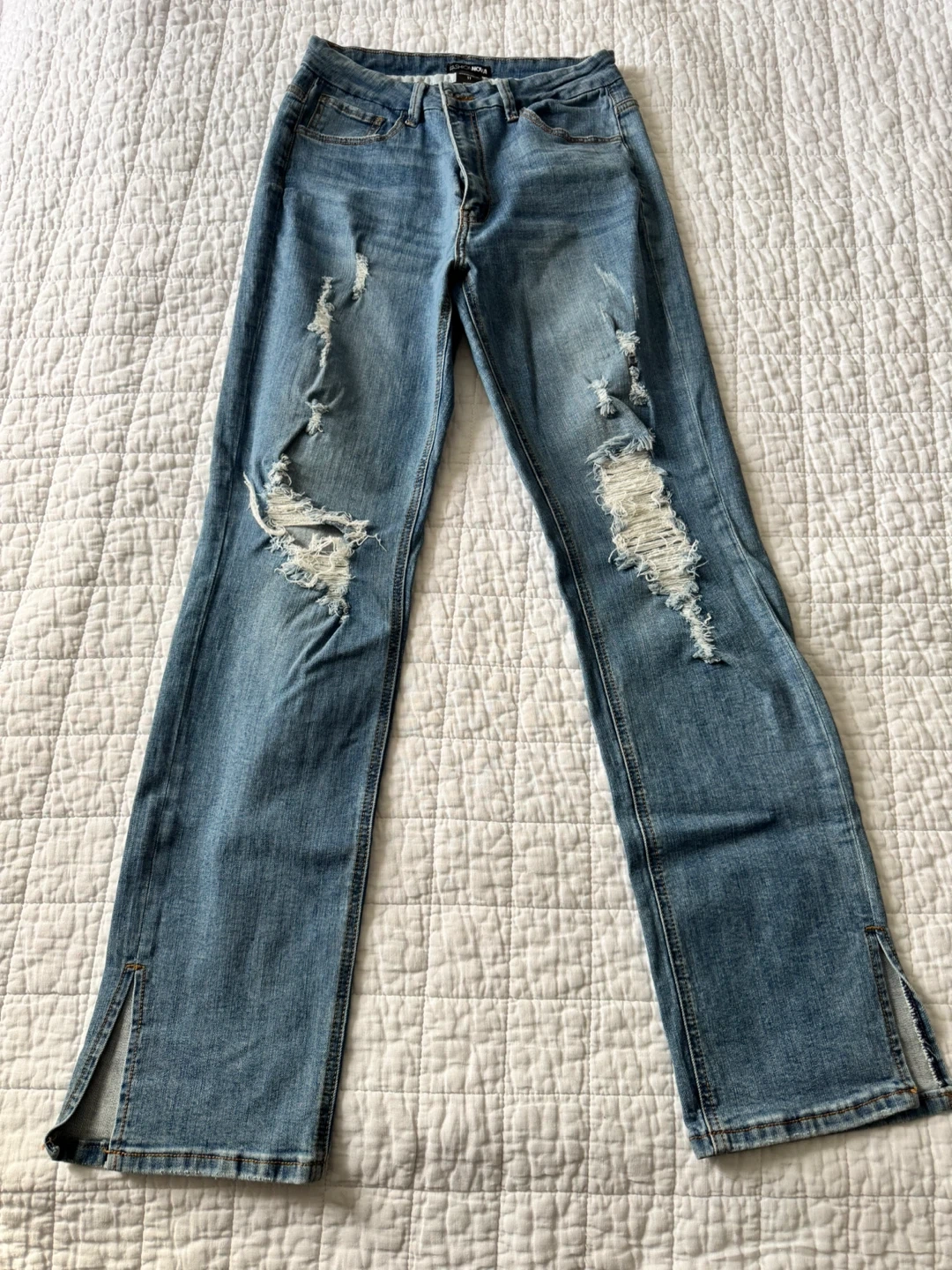 These Fashion Nova jeans feature a distressed flare style. Made from 98% cotton and 2% spandex. size 11 tag. Features split hems for a modern look.